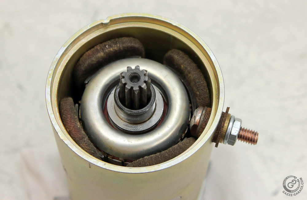 As you may see, the starter motor positive intake terminal (copper bolt) is positioned extremely close to the groove in which the end plate has to be placed. And since the end plate is made of steel, such a close neighbourhood of positive intake to the steel part which contacts with “ground” may end up in sparks. So the third starter motor gasket is in fact an isolator. That’s why it’s wide and that’s why it is inadvisable to assemble the starter motor without it.