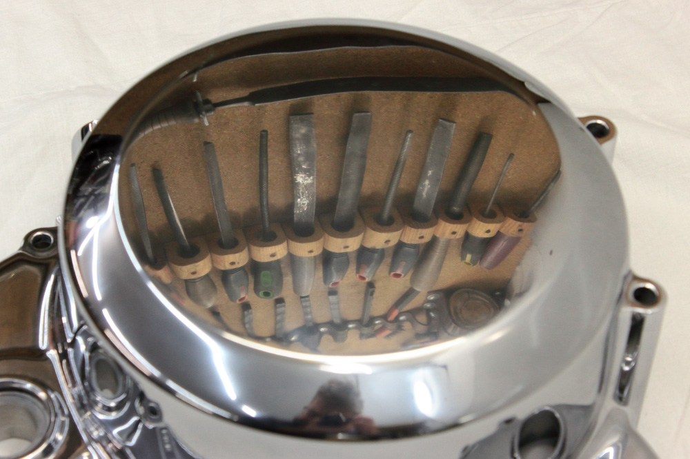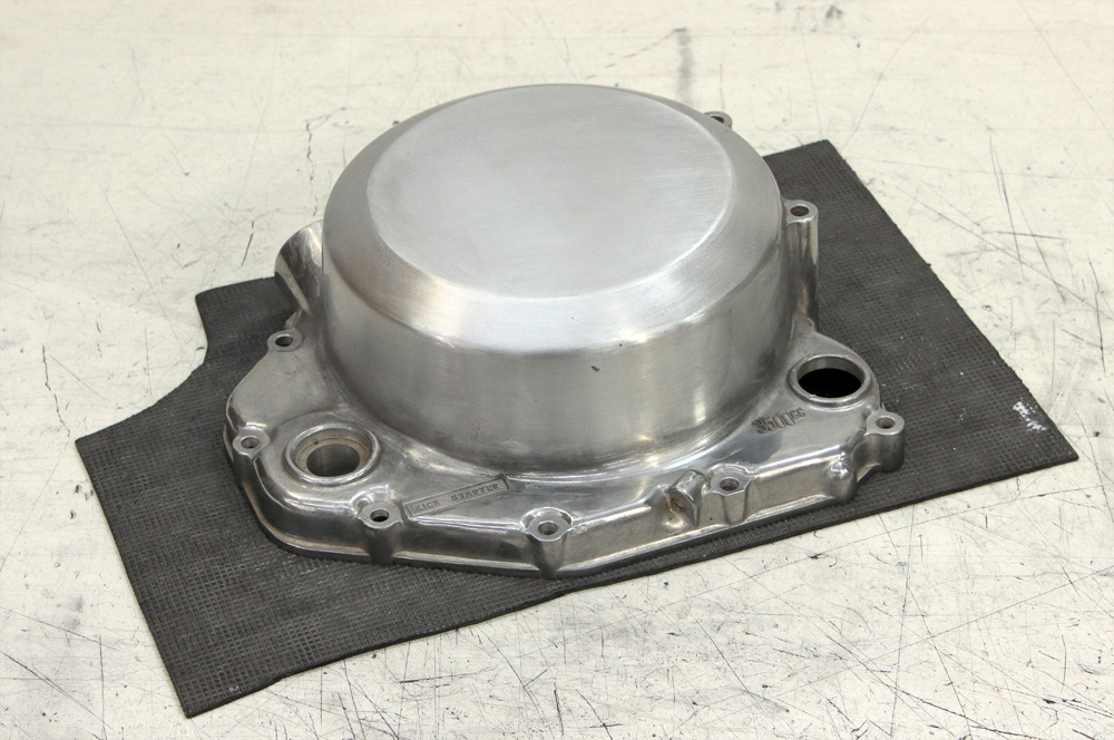 Another batch of parts I polished for our Kawasaki KZ650 project engine. It so happened that once, rummaging through ebay I came across New Old Stock clutch cover. It looked like a good deal so I bought it. Factory polishing was part of the mass production process thus it never intended to be brilliant, and sure, this clutch cover, being stored for 40 years, has got some number of scratches during its “shelf life”. Here you may see how it looked in the beginning of sandpapering. Scratches and factory non polished areas are quite visible: