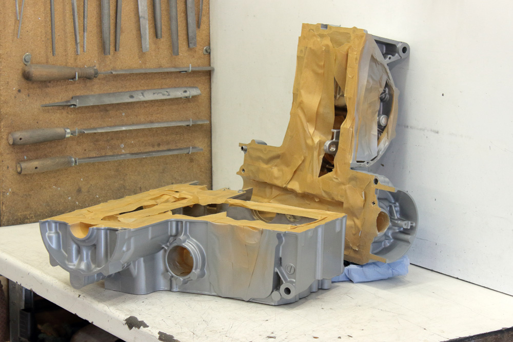 I accurately packed crankcase and went with it to paint shop. Earlier I experimented with engine paints, but after Honda CB815 project I decided to stick with Eastwood engine paint. Their universal aluminum color is exactly shade of silver I like and it’s quite close to silver that Kawasaki use for painting engines, only a shade or two lighter. Painter did the work well and I especially glad that he prefers to paint halves of crankcase separately. That’s essential for ideal result.