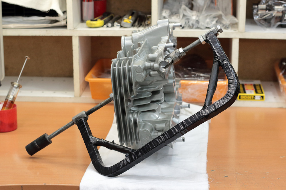 I started engine assembling traditionally for me: from installing valves. This action tunes me up for more complicated assembling works. For cylinder head assembling I use a valve spring compressor tool of my own design. There is a layer of rubber under the tape wrapping (bicycle tube actually). It’s a highly recommended mode for those who don’t like banging freshly painted cylinder heads with bare metal rod.