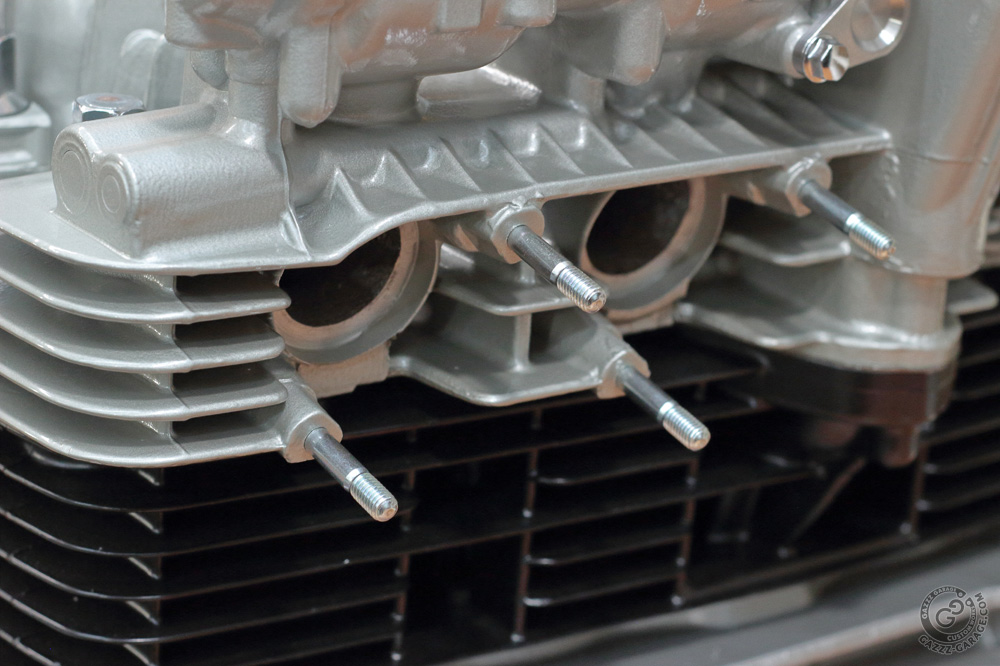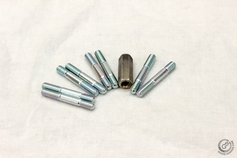 Next piece is about exhaust studs installation. I had at hand an M6 stainless steel connecting nut with one end securely welded. I equipped it with a spacer of appropriate length and a bearing ball of suitable diameter. In this way I got a “special tool” for M6 studs installation. It made the process of installing exhaust studs an easy thing: no thread wrecked and marks on the end of studs are similar to those one may find on factory installed studs.