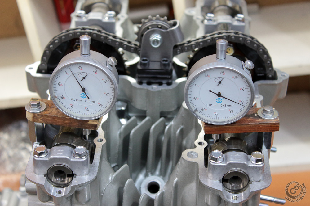 Then I checked that the valve clearance for both the intake and exhaust valves of the fourth cylinder is the same and mounted two dial gauges so they indicate movement of valve tappets.