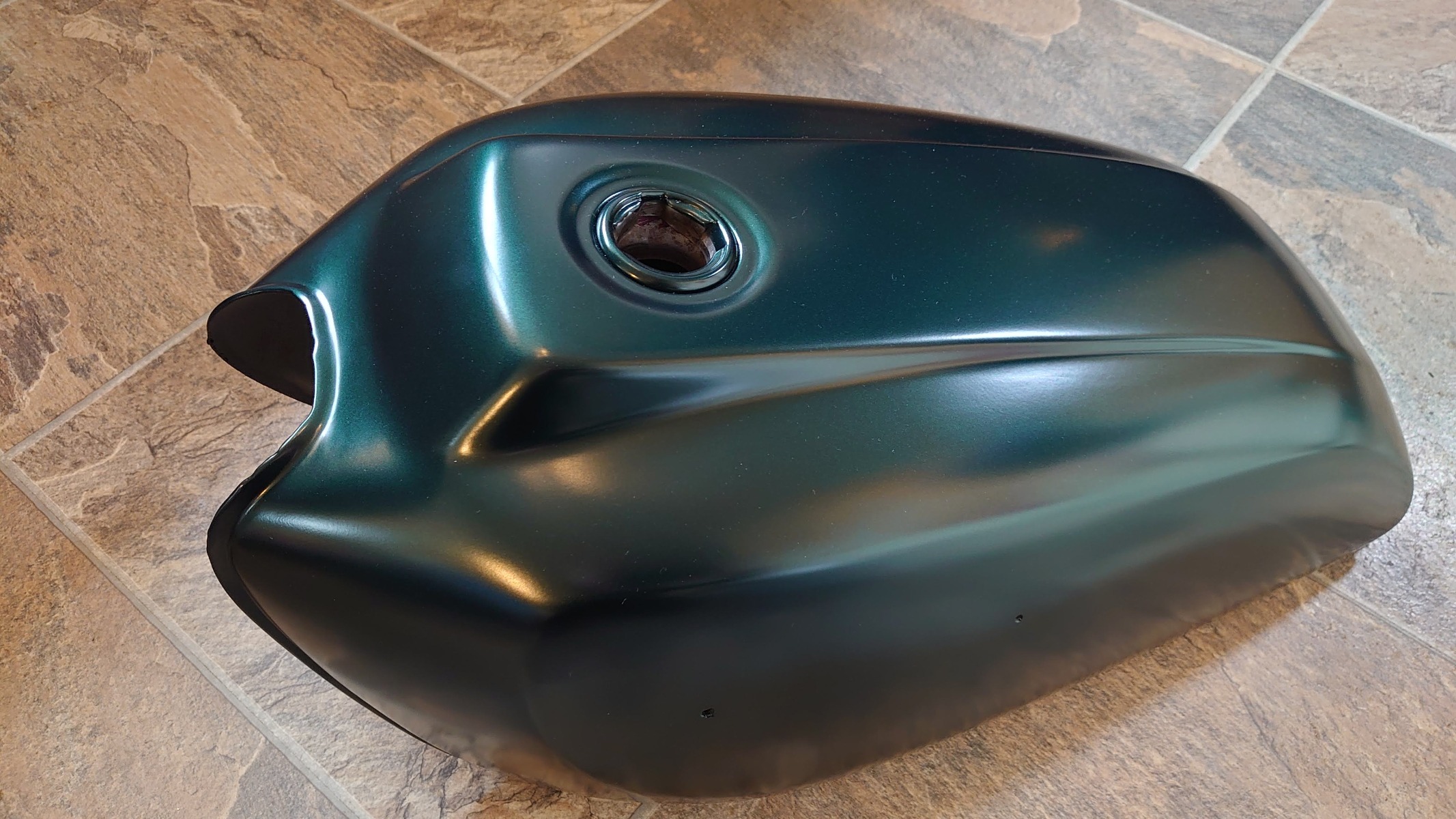 I had a call from the paint-shop yesterday, they wanted me to look at the swatch they had done, for the colour of the tank. I've gone for British Racing Green with a bit of bronze powder in satin, looks great!