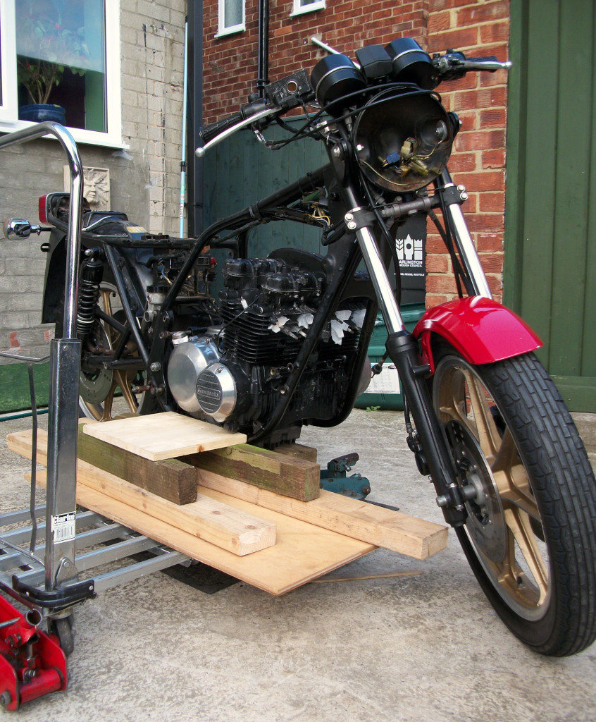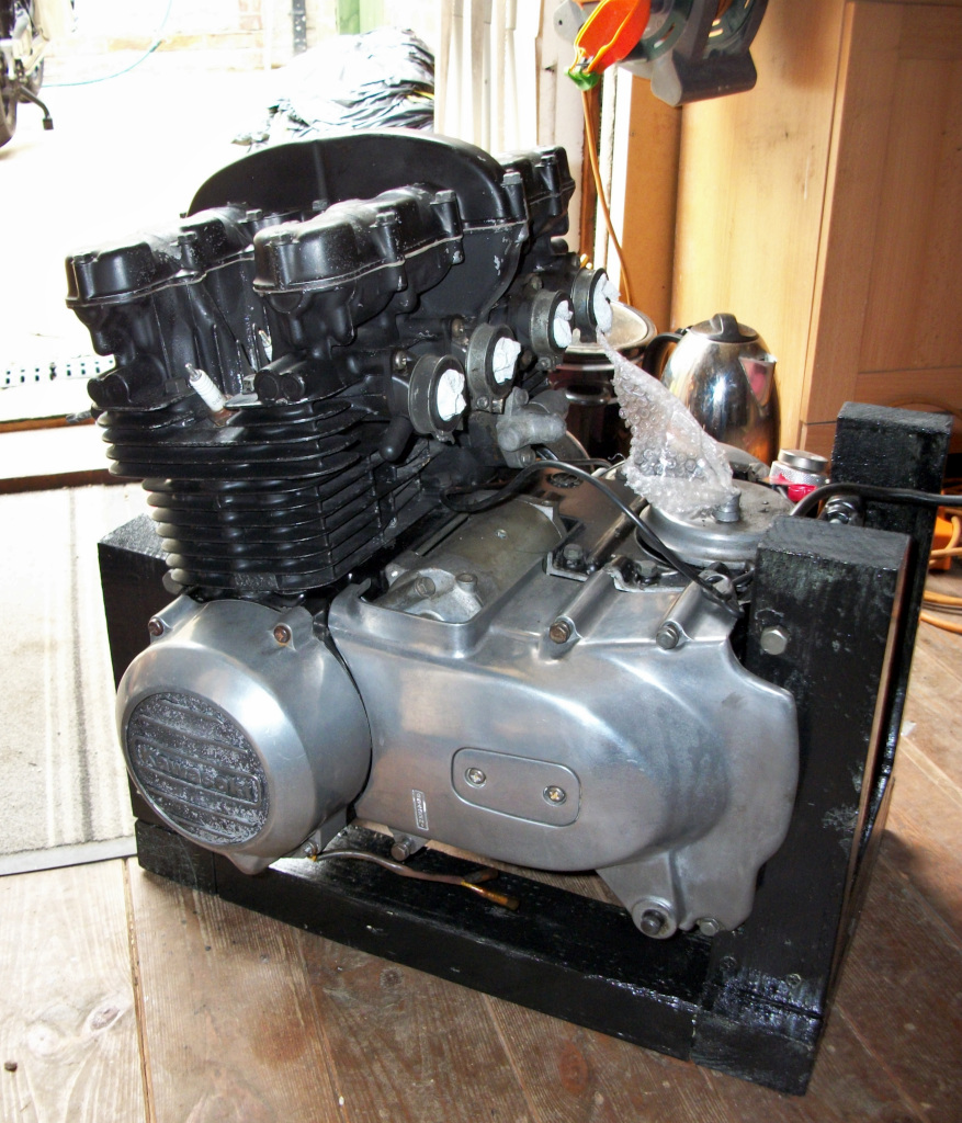 Been a long time since i updated this thread.bike now done and covered over 2000 miles and running great. So more of the story.Engine StandIt has always been a pain to support any engine I have worked on out of the frame so…I set about making something to steady the motor, the obvious answer was to make a framework around it. Not having any metal or welding kit, I had a wander round the back of the potting shed where all the odd and ends go. Found 2 nice pieces of 11/2” X 3” treated timber.After measuring the motors front and rear mount dimensions set about cutting and test fitting the bits and held together with clamps. I needed to shave some wood off to enable the removal / refitting of sump, primary drive and clutch covers. When I was happy I glued and screwed it together. Holes were enlarged slightly for the original mounting nuts and bolts to suspend the engine in the wooden cradle. Had to turn the engine on its back to fit the framework and secure it with the bolts then lift it all upright. A perfect fit. Removed the engine in the reverse way I fitted it, as they say in all good manuals. Gave the frameworks a sand down and a good thick coat of paint.I found that engine could be lifted a lot easier in the framework the and finally placed onto the workbench. If I can find 4 small castors with brakes that can share the 60 Kg or so it would make the shifting round and back on the bench a lot less effort as well as stopping my oil cloth on the bench rucking up and possibly ripping.