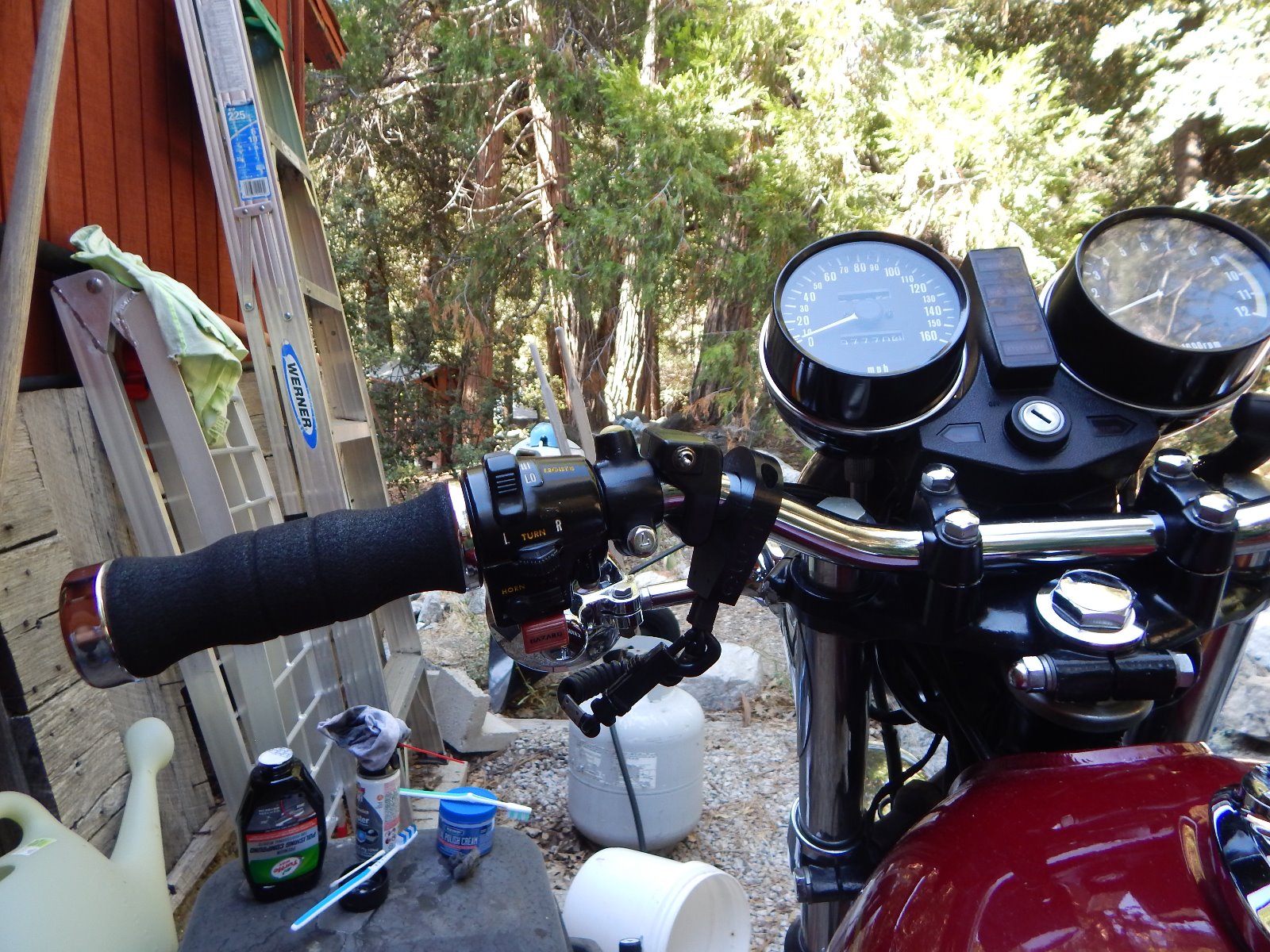Starting the never-ending task of detailing. It never was easy and still isn't . Some of my arsenal of detailing gear. Notice the pin-hole in the left on cap seal of the polishing compound bottle , that lets you dispense small amounts , also the piece of #0000 steel wool that when used with a polish can safely remove surface rust from hardened chrome surfaces and also clean glass, (not plastic)….Keep um Klean….