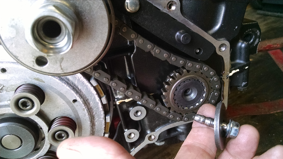 I did take the pistons off of the motor, no biggie since they were just flopping around on the engine after the PO had scattered it all over his garage floor. This motor had multiple problems. The starter chain tensioner towards the bottom of the list.