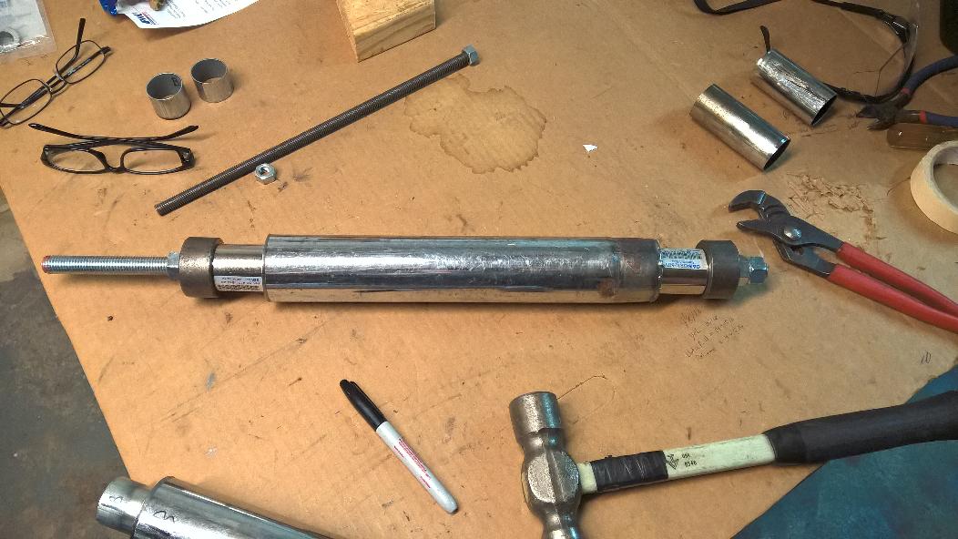 I used a long threaded rod and spacers and nuts to hold the cannisters together for welding. We shaped the endcaps with a chamfer so the tension on the rod would naturally form the cannister-wall into a seal when it was pulled tight.