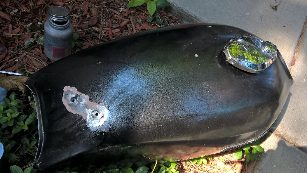 The starnge thing is that the holes look intentional. Maybe they welded studs onto the tank to pull a dent? The tank is dented in there pretty badly. But they ground the metal down to paper thin. At first there were just the two 1/4" holes but after just a light cleaning with the soft wire wheel, several tiny holes opened up and you could see the metal was actually thinner than paper. THe holes were shaped like 1/4" semi-circles.