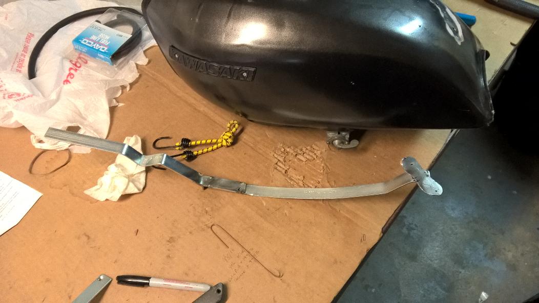 To hold it in place I fabricated an arm that would rest against the tank inlet and would be hands-free using a bungie.