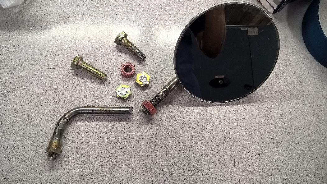 From the two bikes we had two different pairs of mirrors. Each pair had one good one and one bad one. So we took the best of the four and put it on the stocker D4. The other two, I thought were going into the dumpster. One was bent near the threads so the nut didn't turn properly and the other was frozen so it couldn't be adjusted. It was so frozen, the sheet metal on the back had buckled from people trying to move the mirror. So I came up with an idea to make them smaller and more easily adjustable.