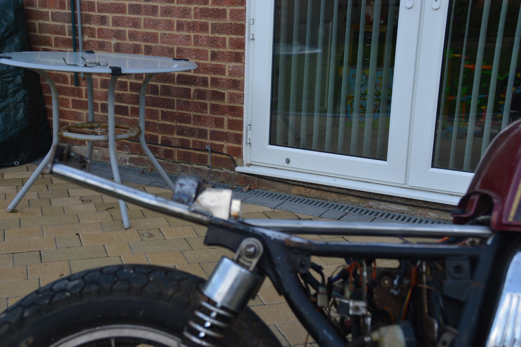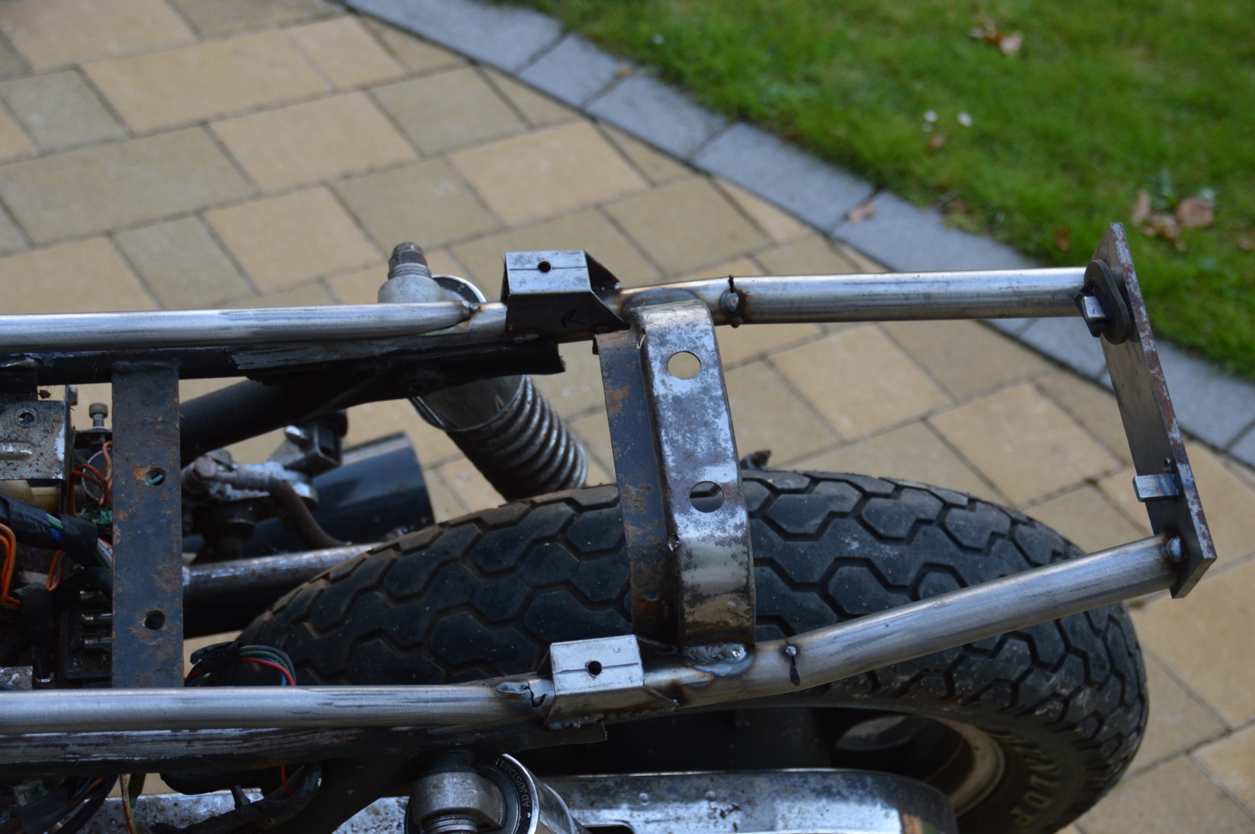 busy weekend getting the rear end back together after a PO cut it off. im sure the handling was great due to the lack of shock brace! work supplied a table for the frame tubing which was the perfect size inside and out,two chair legs for the seat riser tubing and a KZ 400 frame gave up the brace and inner rear mudguard