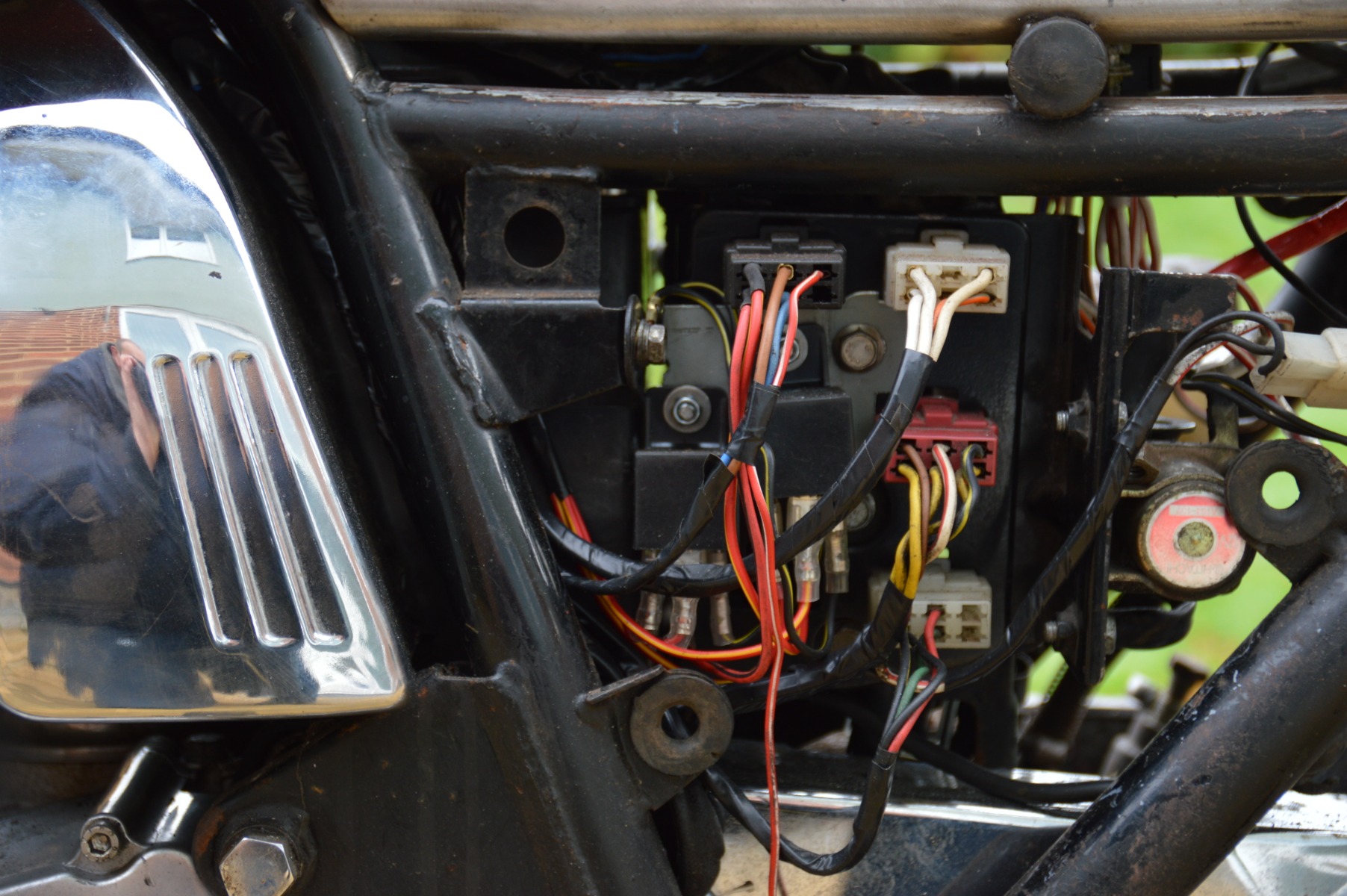 electrics finished, got rid of safety devices and light bulb fail unit thing. two relays added for high/low beam it even got hazzard light which is new for me on a motorbike. swiches are from ER 650 luckily it seems kawasaki havnt changed wire colours so they were not too bad to wire