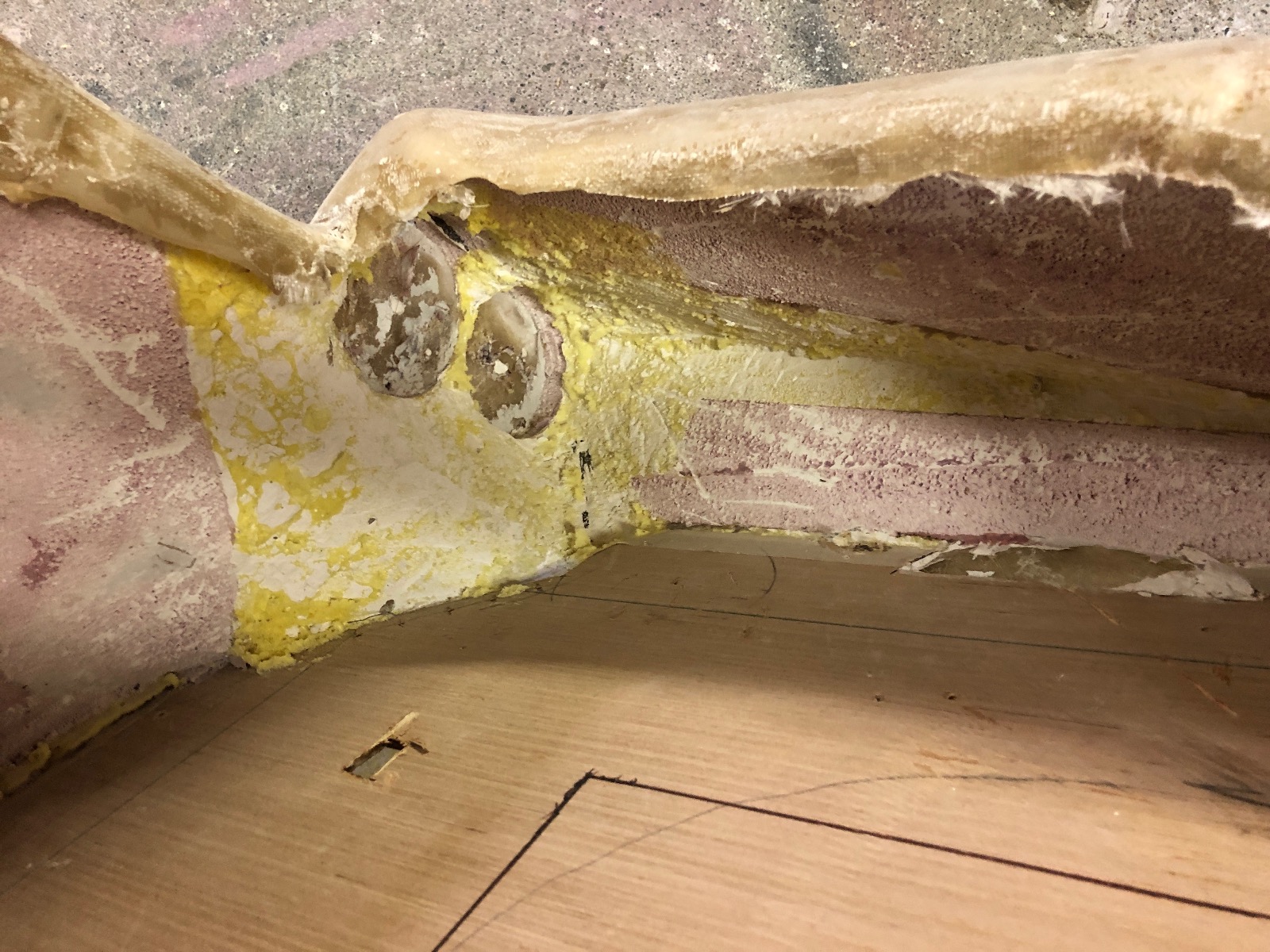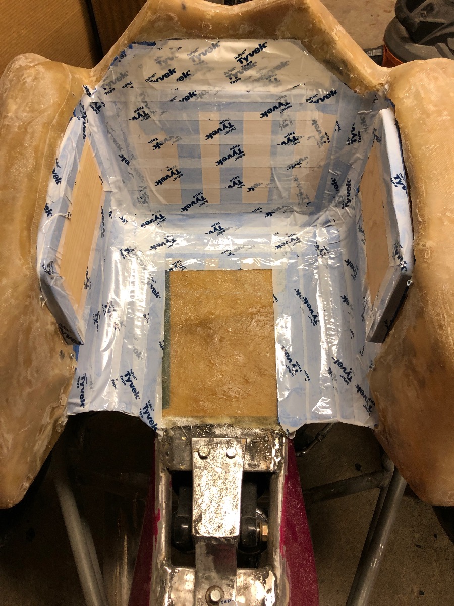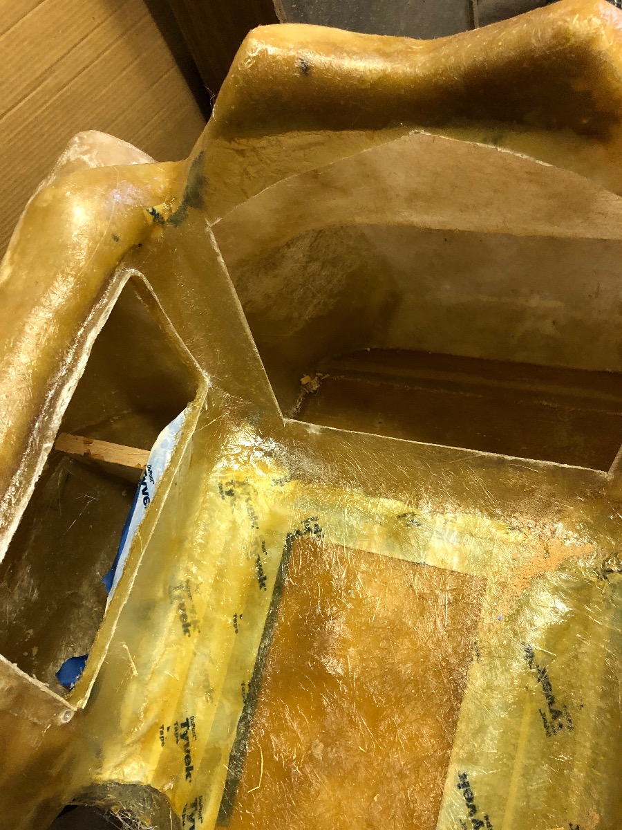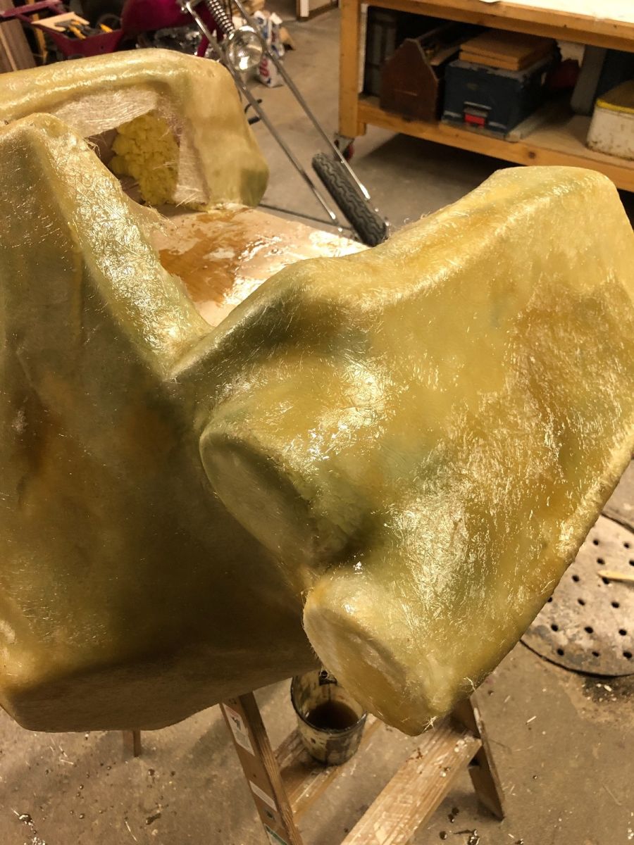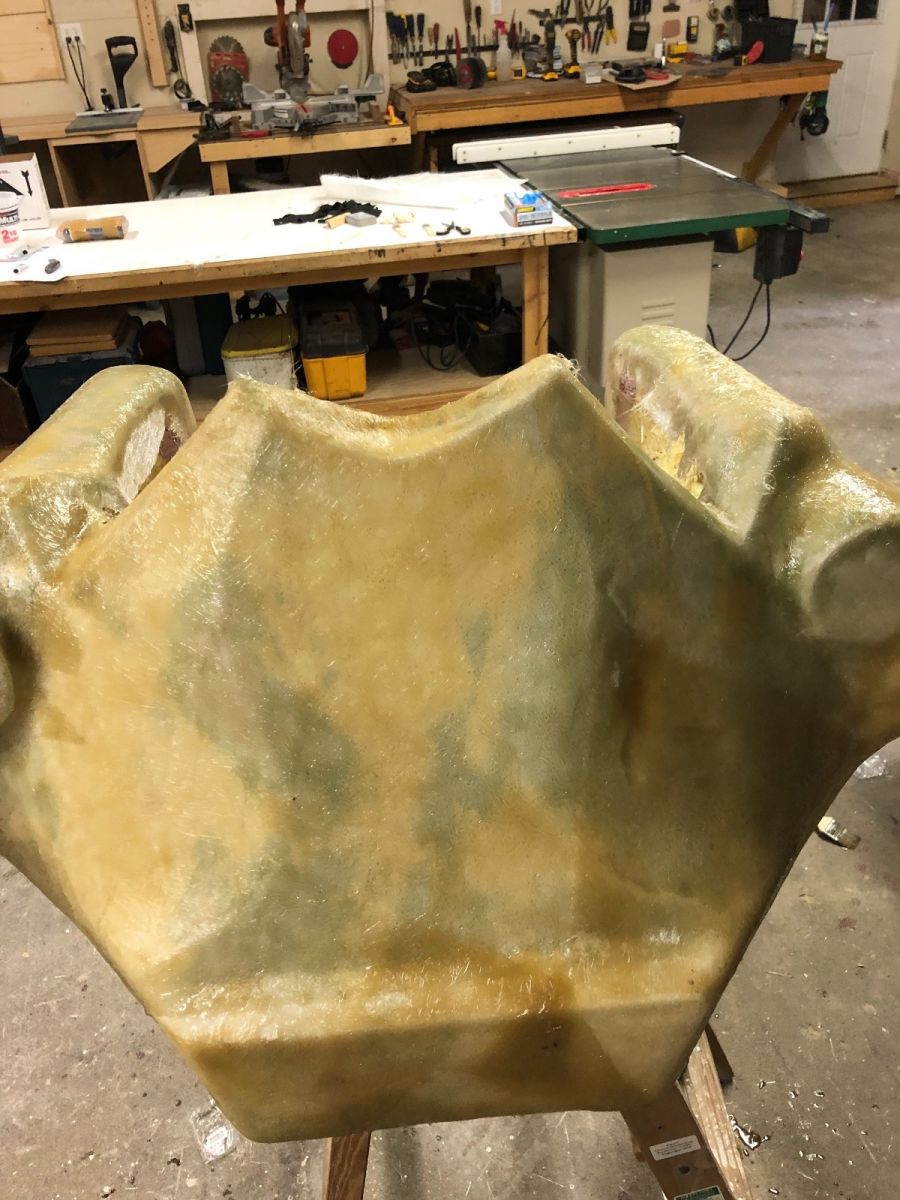 laid another mesh layer then a weave layer.removed the foam and mud form with any hand tool that fit to chunk it out. I need to wash the inside out with TSP and acetone then add reinforcements and an inside layer.Here is it rough sanded with 100 grit and it only weighs 20 lbs right now.
