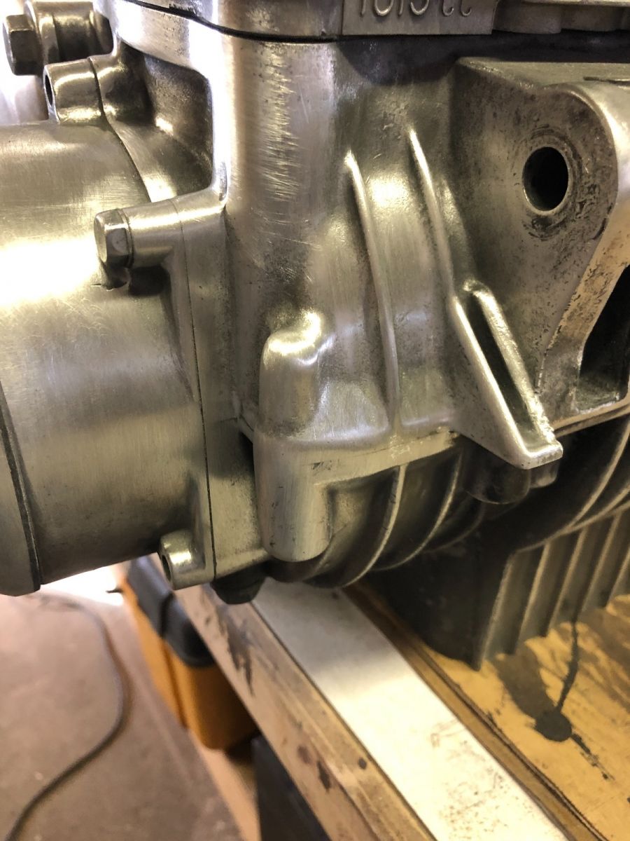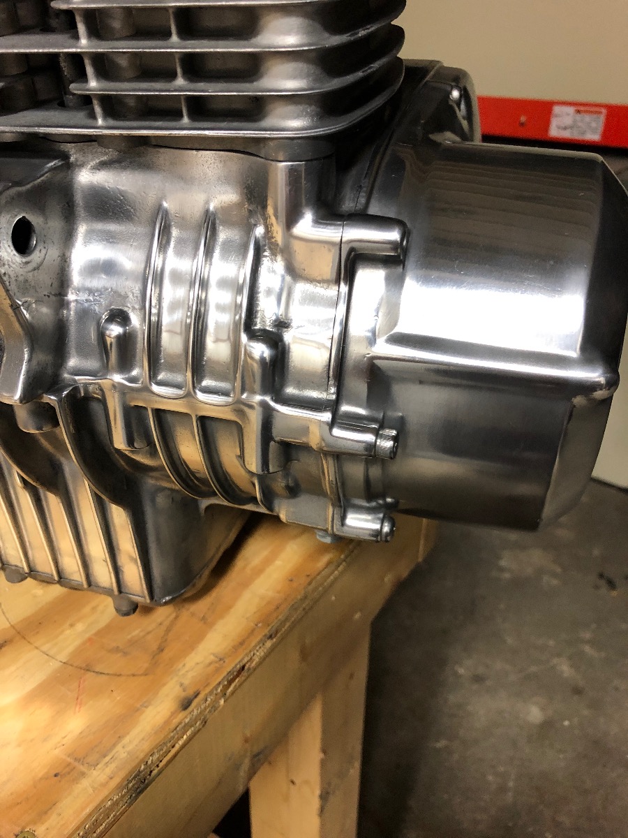 600 sand and rough cut, looks pretty close to me.Going to paint jugs, oilpan,and valve/cam cover all black.still trying to decide the original flat or a little more sheen.I will shark hide the polished aluminum when done.