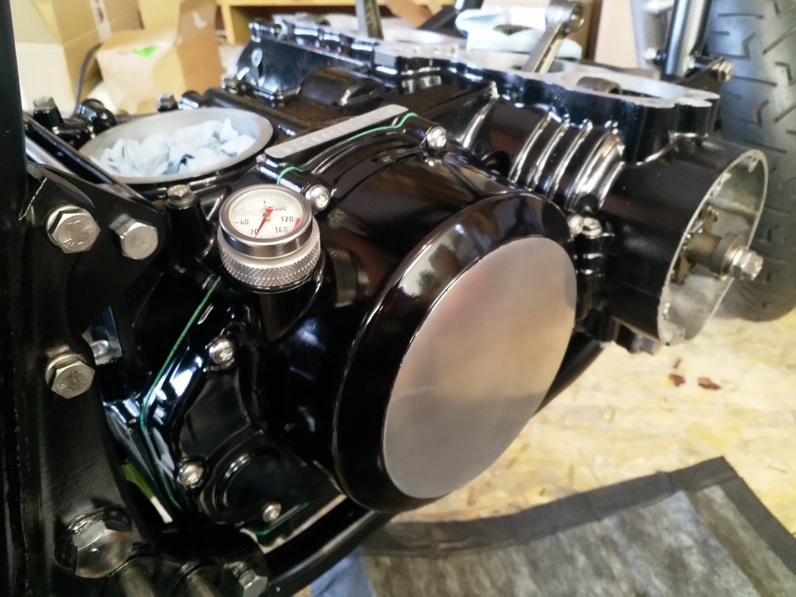 Getting the clutch, alternator and pickup coils back in. Also put my nice shiny breather cover back on.