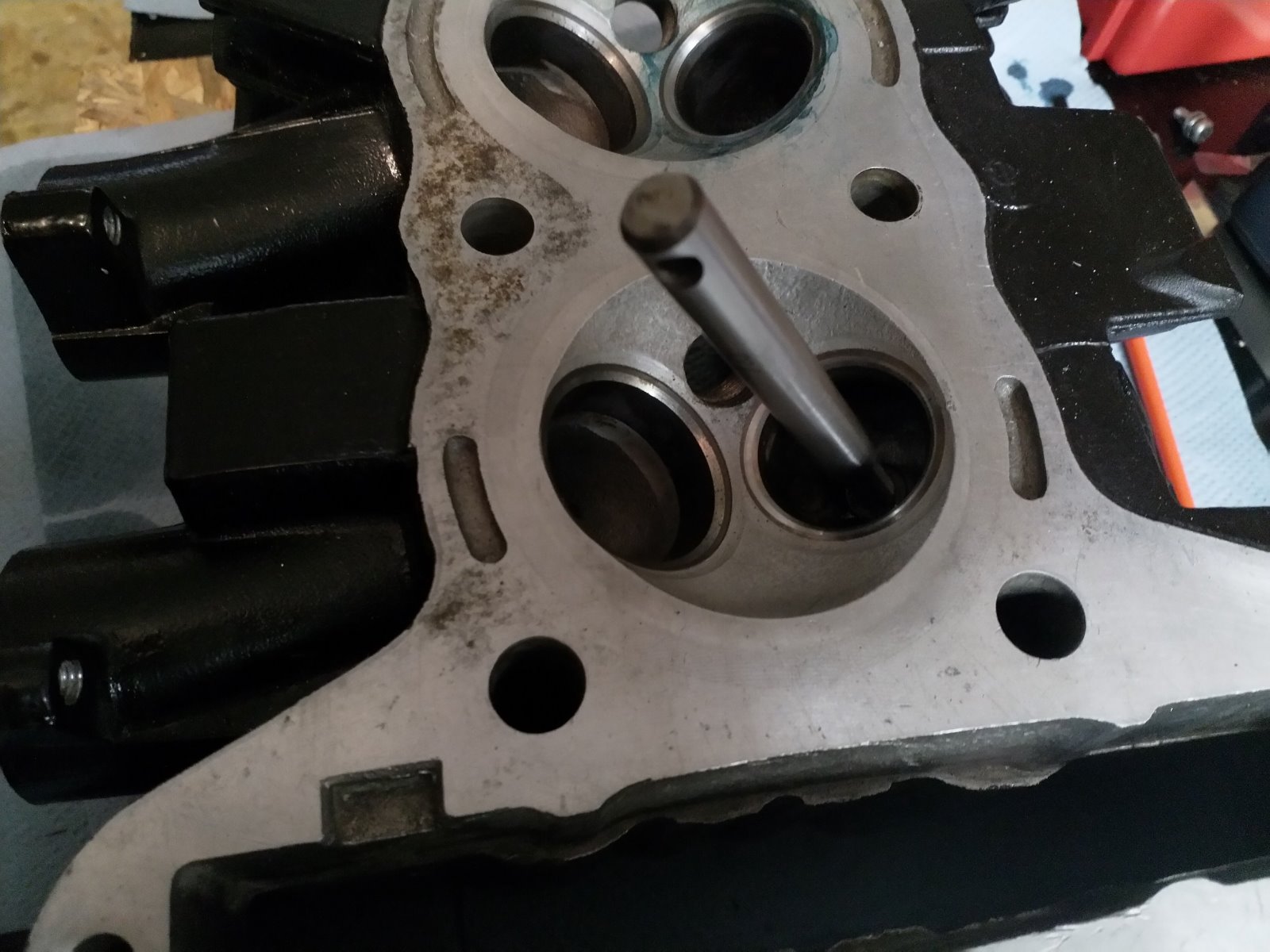 Valves cut and reassembled, head back on, camshaft and valve clearance checked, cam height measured - all good except of course the valve clearance after doing the seats. Also checked the head surface with a straight edge - was just within spec - 0.03mm feeler got under the straight edge in some places and the tolerance on the edge is 0.018mm over the entire 500mm length, manual says it should be under 0.050mm.