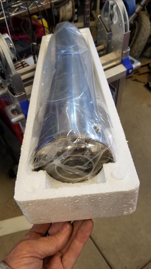It came with p/n PR2292 "Megaphone Universal Silencer". Since I bought it from Z1 Enterprises, I did not know they were available with different silencer types. I was thinking about using a more modern bike's muffler, or modifying the end of the collector to angle this one up higher. I'm not fond of the muffler being level or near level.