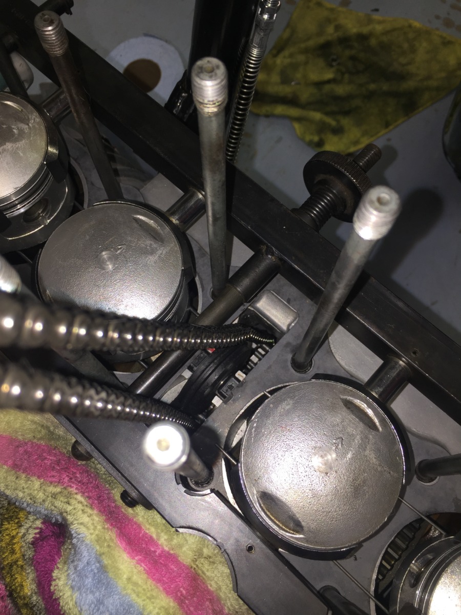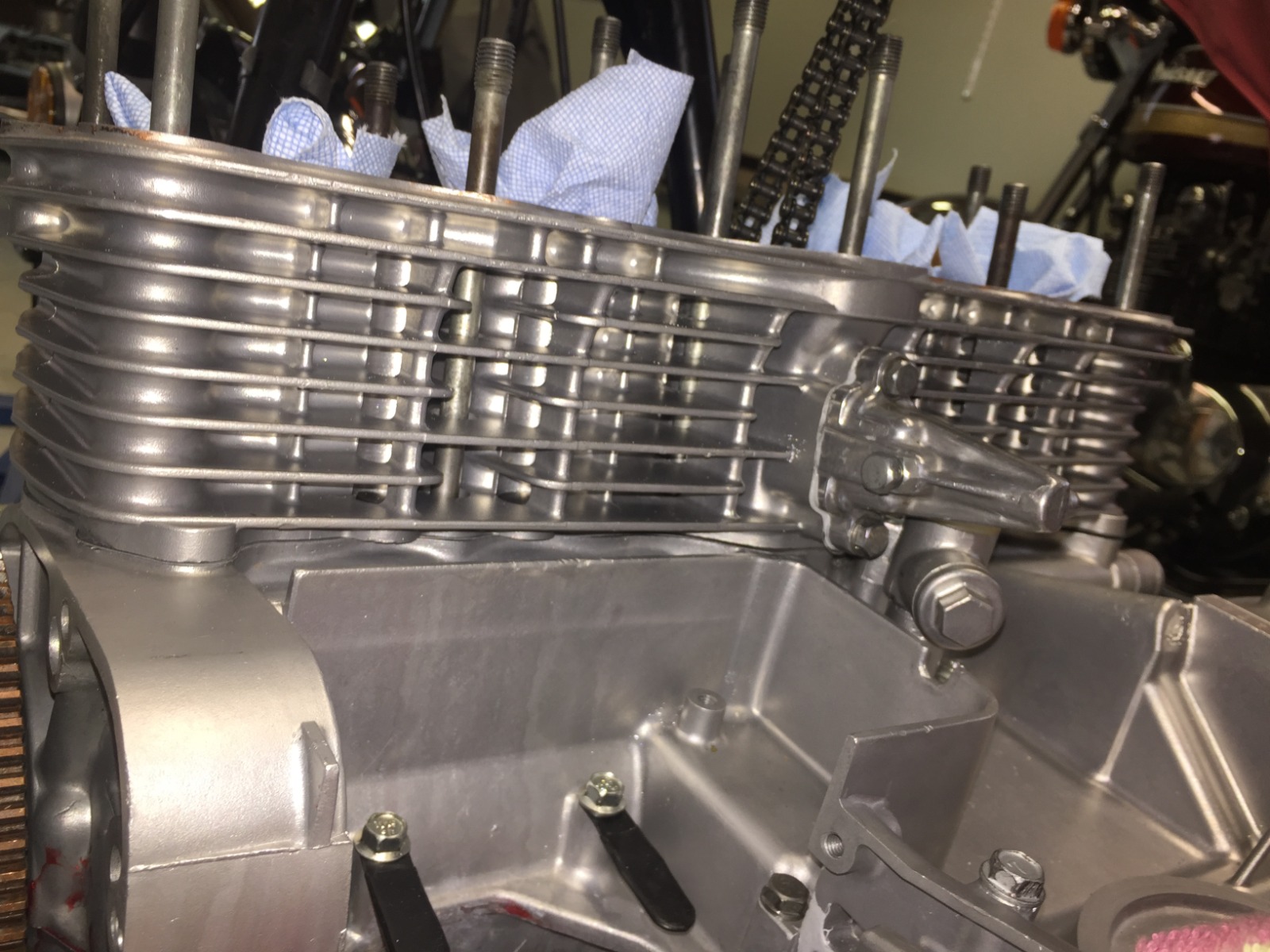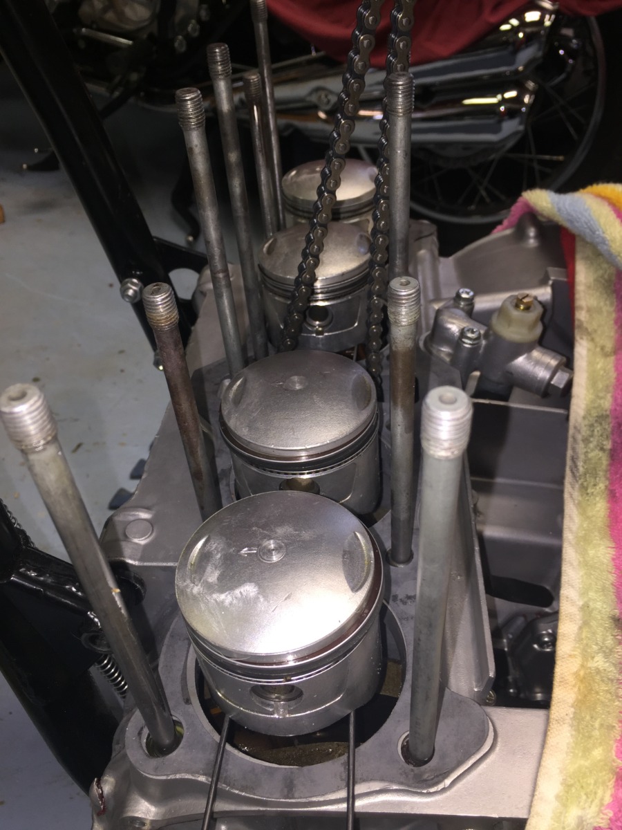 Thanks for the pictures. Thinking back on my decision making process at the point of installing the pistons one of the issues was that I didn't have the original support wires and was trying to figure out what to use in their place. The skirt on the bottom of the Weisco pistons was also different than the stock pistons and like I said I didn't want to damage the new pistons messing around with something I didn't fully comprehend. It's not an excuse, but I was also working on this project in between other job assignments I had so time was a real concern for me. If there's a "next time" perhaps I will try to use something like brazing rod to sneak under the pistons and hold them in place. The tool I have is for the 1000 cc pistons. I did learn that a good chamfer placed around the bottom of the cylinder sleeves is critical for easy piston installation.