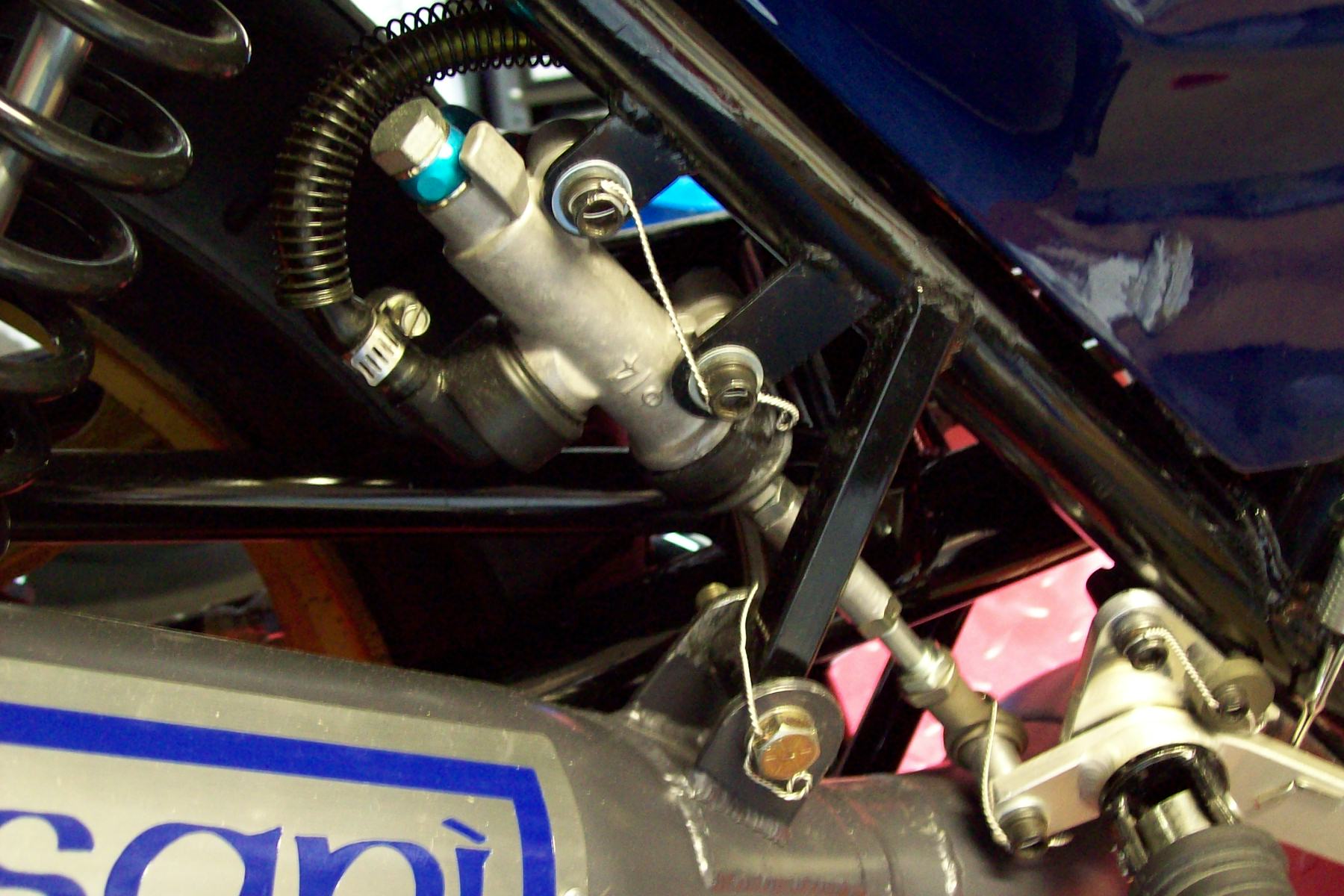 For the rear MC i made a bolt on aluminum adapter plate for my Tarozzi foot rest with a direct linkage and a hydraulic brake light Switch for the Banjo bolt.