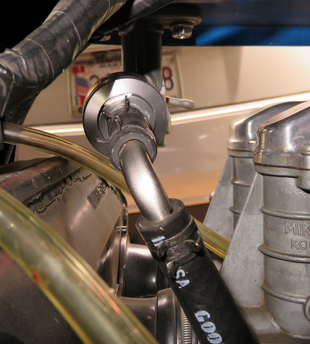 For fuel hose I use Goodyear 5/16" Fuel Hose SAE 30R7 (required 8") Part # 65123. For clamping the hoses I use 5/16” spring clamps. They are a million times easier and quicker to use than the screw type. Some auto stores sell them or they can be easily found on eBay.
