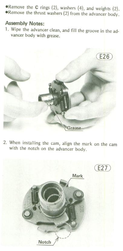 It starts on page 44 of the 1978 Kz200 service manual. It explains how to remove the advancer and how to remove the cam lobe from the advancer.
