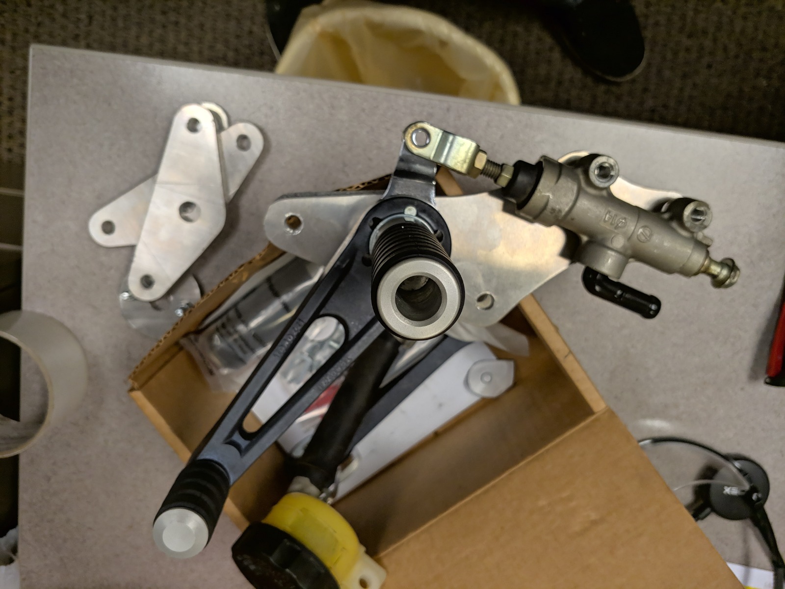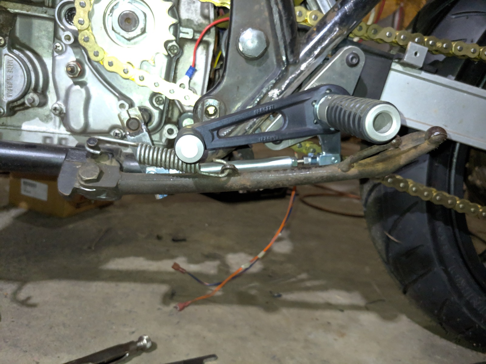 I also made brackets for the new rear sets. I need to adjust the linkages on these so they don't hang so low. They work fine, but i want a side exit exhaust on both sides coming out behind the foot pegs. Kickstand will be moved forward as the foot lever hits the spring.