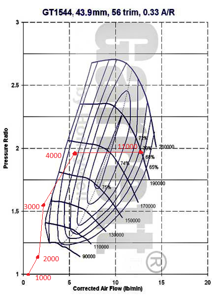 I did a quick calculation for the compressor map... and it looks pretty good! i assumed boost would build up to 14psi at 4000krpm and stay there till 11,000.