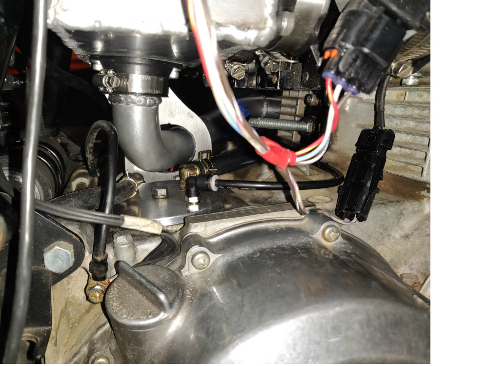 I played with one more turbo oil feed setup. Its a m18x1.5 to m10x1.0 bushing with a M10 to 4an banjo. This is lower profile but it would still get hit if the bike falls over..... So i'm keeping the old setup.