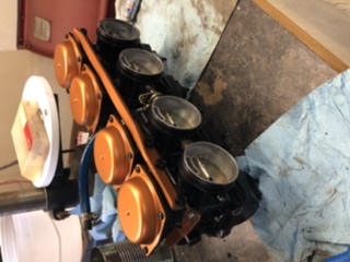 With all the above done or in the works, I turned my attention to the carbs. They were giving me issues late last year so they were stripped down and one by one spent time in the ultrasonic cleaner. Once cleaned I realized bare aluminum carbs on the blacked out engine wouldn’t look right. The carbs were masked off and sprayed with VHT high heat roll bar and chassis paint and the carb caps and carb attaching rails got the VHT Copper metallic paint. The float levels will be set before being installed onto the bike but that will only happen once I get the new idle circuit needles and gaskets.