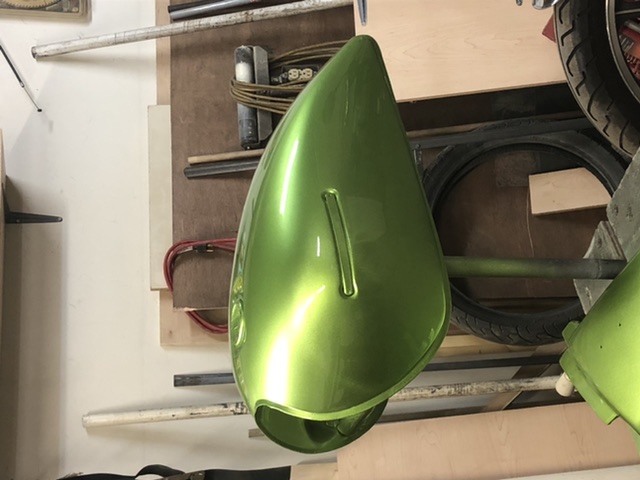 I decided that there is too much black on the bike and needed to brighten thing up a bit. A quick trip to my shed revealed what I was in need of. I went through all the paints I had from previous projects and came across a 1/2 pint of something that I figured this old Kawasaki needs, a nice Camaro lime green with a touch of heavier metallic added. The emblems were removed, the tank was sanded down to remove the factory striping, 2 coats of high build primer were sprayed on and the tank was block sanded to reveal high/low spots. Fortunately, no filler work was required so a coat of sealer was sprayed on, then 2 coats of base coat followed by 3 medium wet coats of clear coat. To me the color says Kawasaki. Not an original Kawasaki color but I’m looking to sort of modernize the look of the bike.