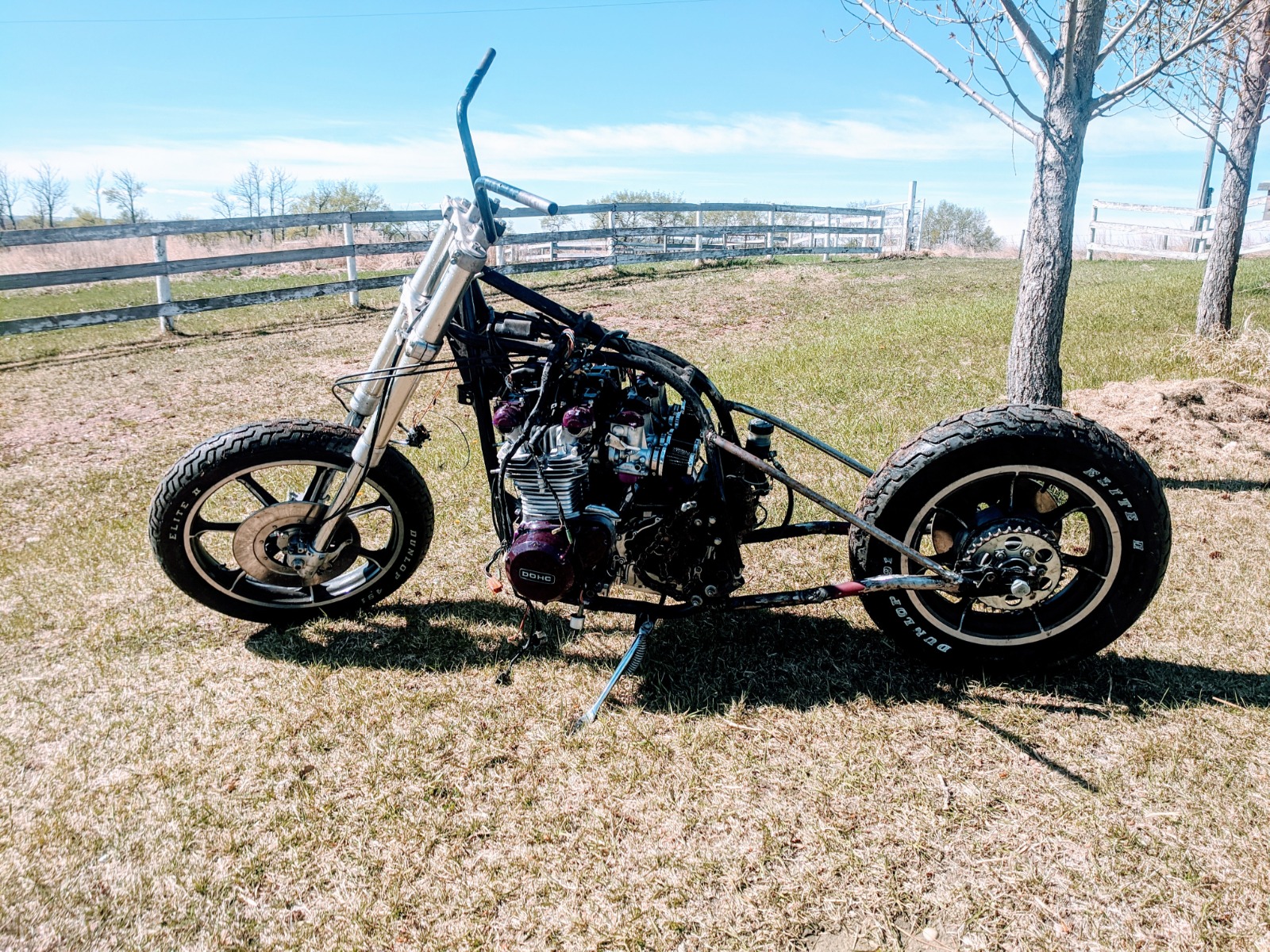 Hey so I'm new here and I just wanted to show off this project I'm working on . So I have a feb/77 made kz1000 which is actually coincidentally the same month and year I was myself born haha. I have stretched out the rear end and hardtailed it. I did the fab and welding ect myself. I put a set of Honda cr500 forks on the front and I think it looks pretty mean. The tank is off a early 80s Honda or maybe even a 70s not too sure. The handle bars came off a Yamaha quad and I am going to add a suicide shift to it yet. This bike is all me and I started with a near mint kz with 12000 miles on it and I have created a monster. I will update the project I have many tricked out things I'm gonna do. I'd like to hear your comments and remarks. Thanks all