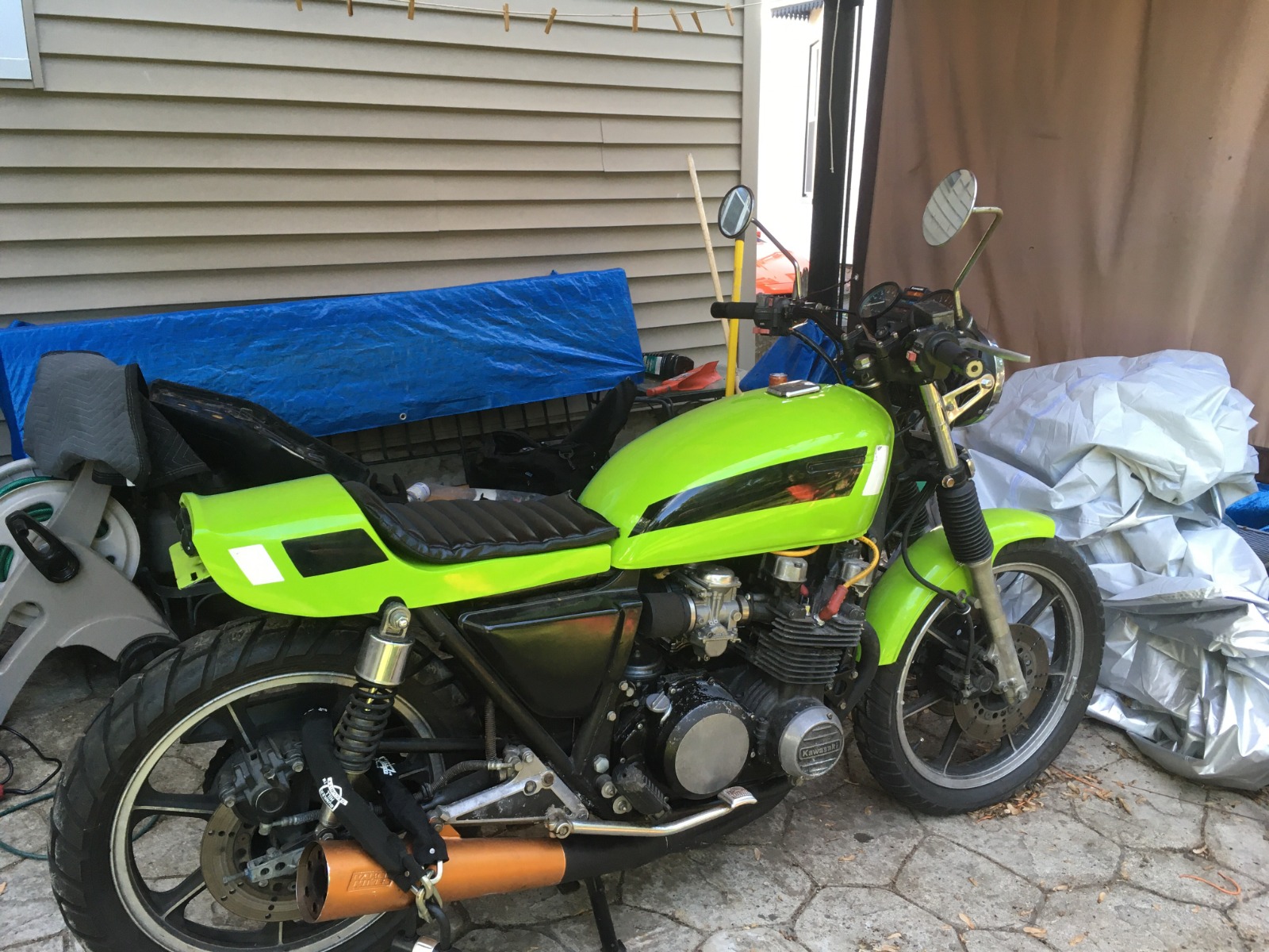 I picked up this 1982 KZ750-E3 from a friends garage a couple weeks ago. This is my first bike, ever. After comparing the current and original odometers, bike has ~19200 miles on it. The plan is to get it running (hadn't been started in ~2 years) and do some body modifications of my own to bring it back to a stock-ish look. Before it was mine it had already been upgraded with pod filters, LED headlight, tail lights, turn signals, and low profile tach- and speedometer. The tail portion of the frame was hacked off just past the shock mounts and welded with a cross bar. A rear fairing was fabricated over the original and the mounting points were modified to accommodate. The seat is thin and "fastened" to the fabed bodywork with glue and velcro (I shit you not) that has since melted and failed.