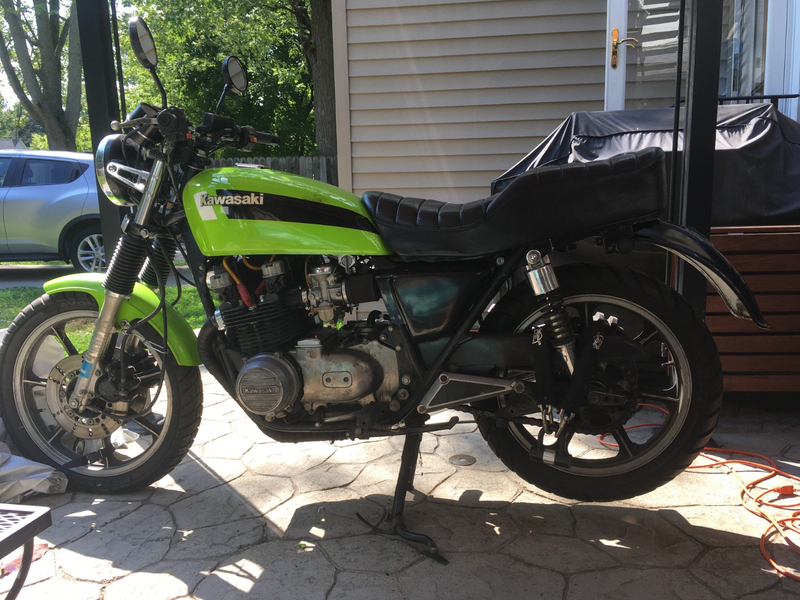 Added a KZ1000 Police fender (which I will be painting green to match) and an OE KZ750 taillight housing, then fitted my integrated LED brake and turn signals into the housing.