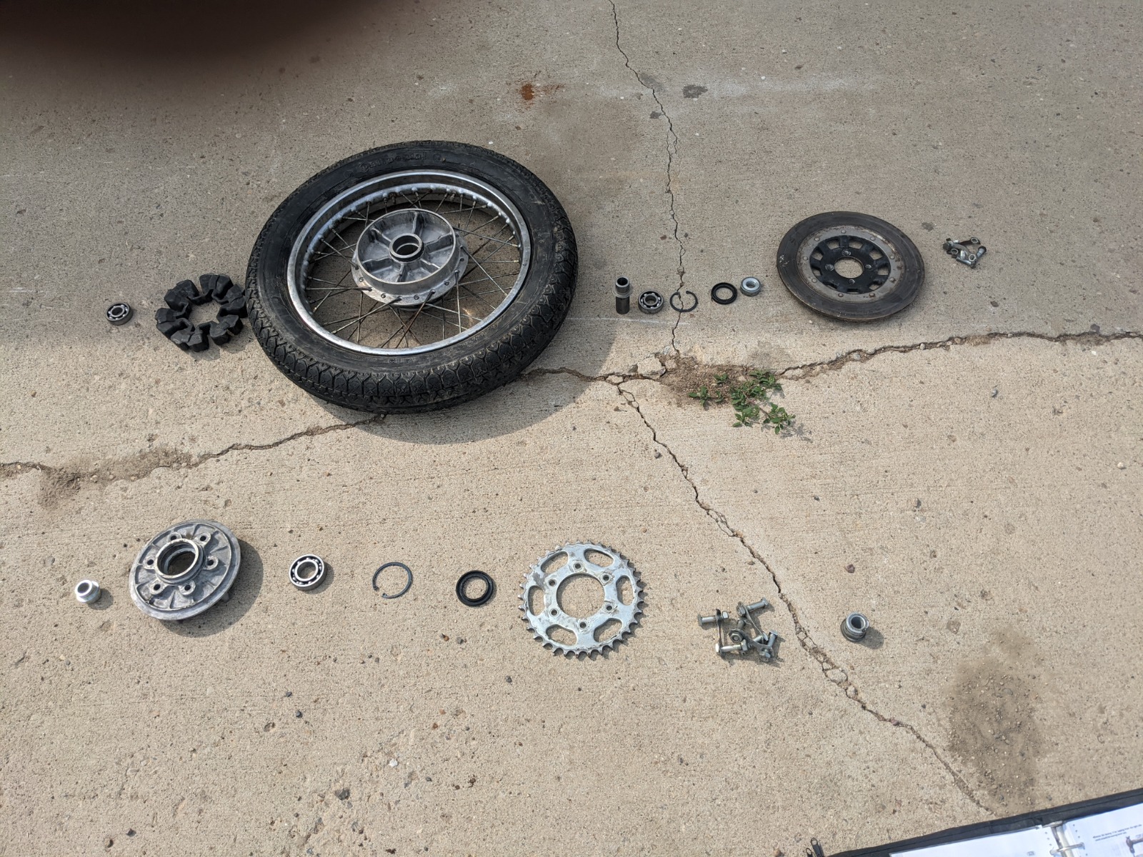I started degreasing the rear wheel while it was off, and things just sorta progressed from there. Long story short, pulled it completely apart today. Degreased and pressure washed everything, followed by a healthy shot of WD-40 to prevent rusting while I wait to put it all back together. Need to pick up some bearing grease tomorrow.
