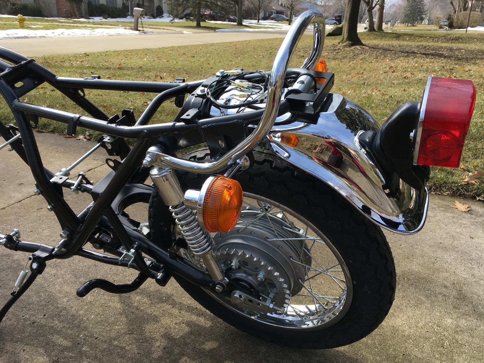 Got the front brake hoses, and splitter installed. Turn signals, rear seat stay and turned the front fender around. Then I played around and mocked up some body pieces I picked up over the winter. They were boxed back up till they can be painted.