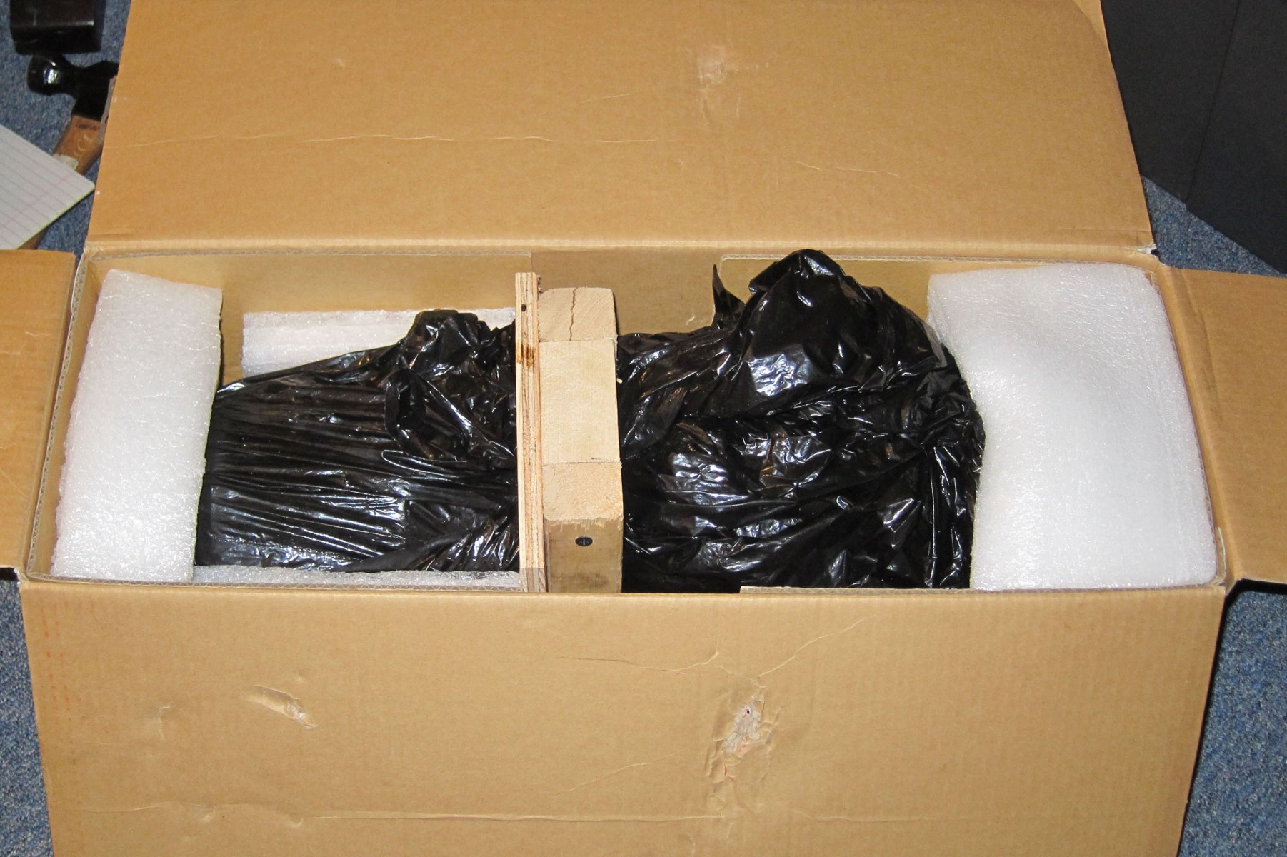 I had a very sturdy double walled box from some car shocks. I made a plywood base that just fit inside the box, and then built up pads to support the crank at the bearings, and screwed blocks over the top in the center so it couldn't roll around. Then I packed the box with foam. It's probably one of the best packing jobs I've done. It was so heavy, I was really worried that if I didn't bolt it down in some way it was just going to explode out of the side of the box like the Kool-Aid man.