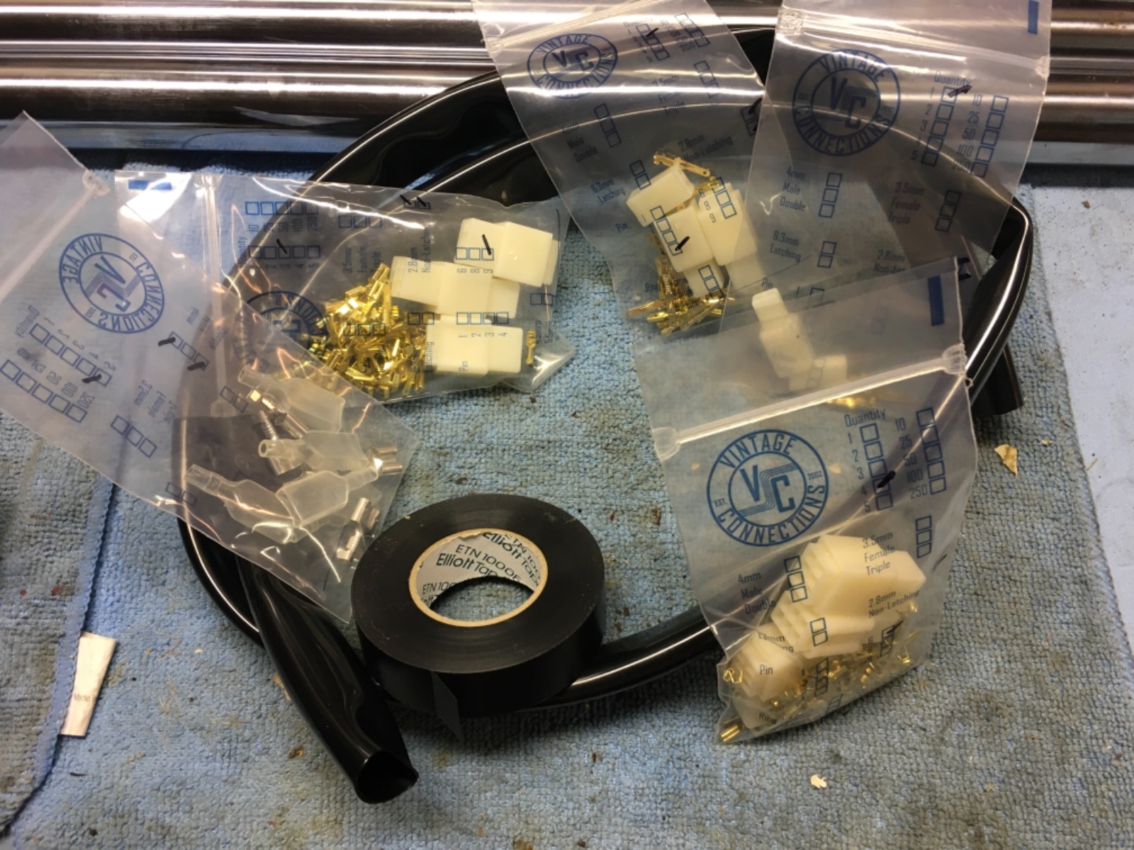 Behind the scenes I’ve been working on parts selection and detail work on small parts. Till I’m 100% on the crankshaft, I’m trying my hand at harness restoration. My test piece is a ‘77 1000 A1 main section in fair condition. My A4 harness is better so I figured if I can revive this one my original harness should be easier. I cut back the tape and sheathing back far enough to expose the terminals and a couple inches of wire. Opened up any rubbed spots for inspection and left the rest intact till I can get it mounted on a section of board and lay it in its natural relaxed position. Not concerned if I damaged the rest of the tape I soaked the entire harness in purple power. Lifting sections out to scrub. I pulled back all of the connector covers and scrubbed them also. Rinsing the harness off I still didn’t think the color had been restored. About a mont ago I accidentally dropped a rear tail light ground cable into metal rescue. A few hours later when I pulled the part out I noticed how bright and clean the ground lead looked. Again I’m not too concerned with the harness surviving I thought I’d drop it into metal rescue and see if it would brighten the colors and the brass connectors. It worked pretty well. I made all of the repairs necessary ordered some sections of gloss black sheathing from vintage connections along with some other connectors in the off-white almost yellow color that perfectly match the OEM. I also picked up some Elliot tape. My question is after this long description of work, how is the Elliott tape used. I had assumed it was not adhesive backed but in reality it is. The OEM tape that I cut off of the harness had no adhesive on it, or after forty years it’s dried up.