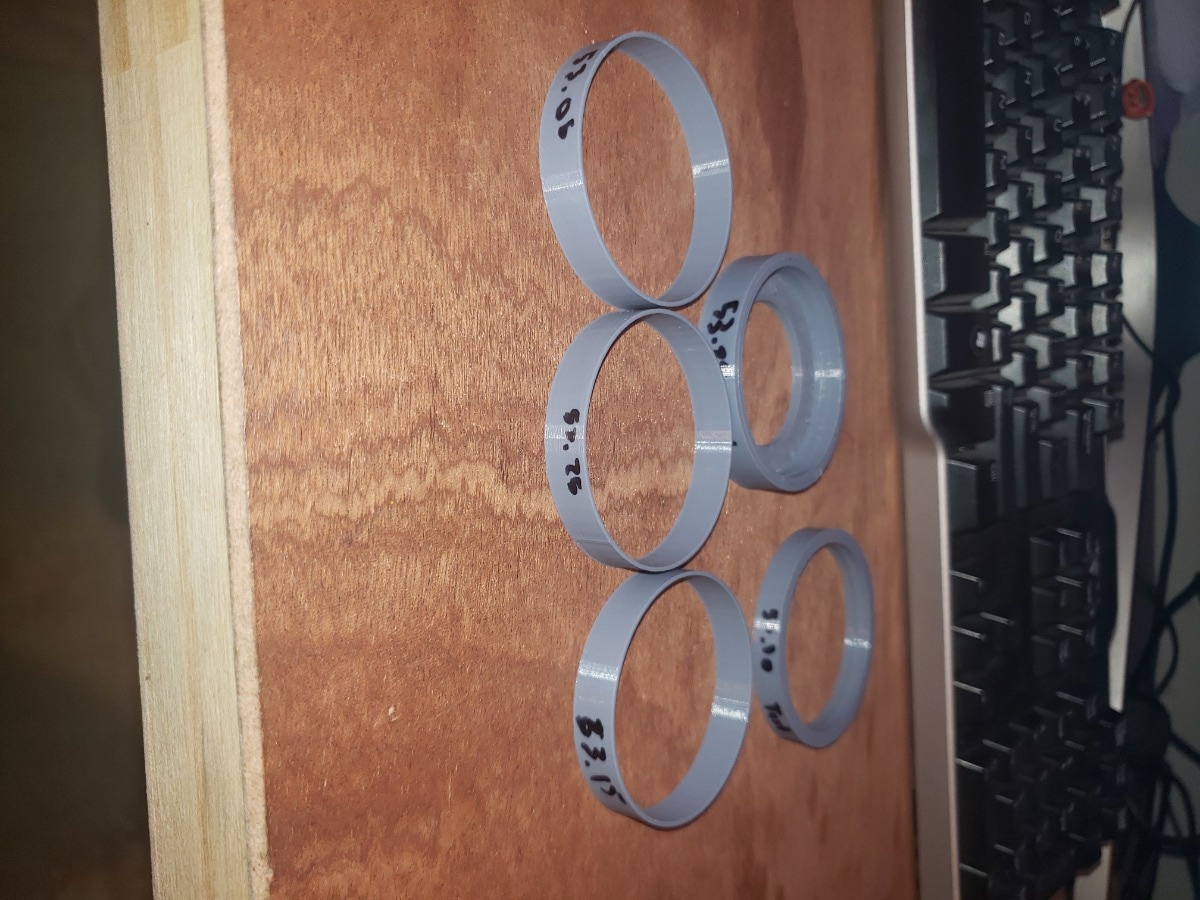 Before designing my actual adapters, I felt it important to gauge my 3D printer's tolerances and manufacturing capabilities. For this, I printed several rings of different ID's to see which felt best to put on and take off of the throttle body. The proper throttle body OD here is 53mm and I tested from 53.05mm to 53.25mm in 0.05mm increments. I initially liked the fit of the 53.15mm diameter and used it for V1 of the TB adapters, but later changed it. Below are some pictures of the test rings I printed. Keep in mind, 1mm is 0.040" and those increments are grasping at my printer's max resolution.