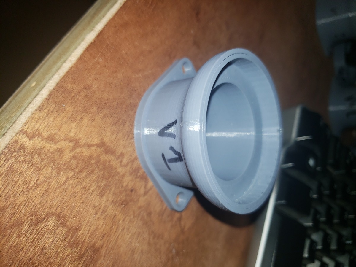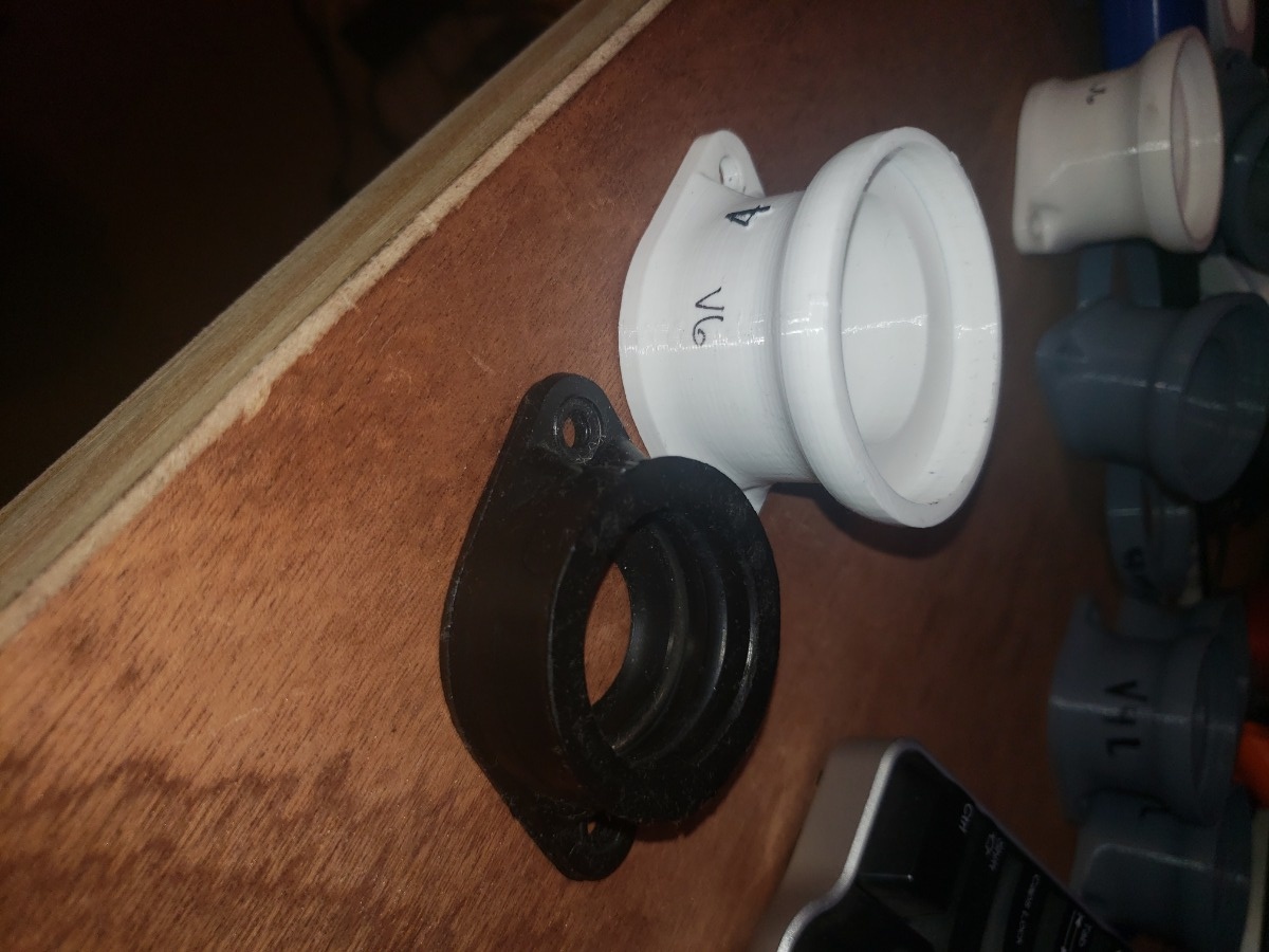 Now that I had a target ID for the TB adapter lip, I started designing. V1 was a simple design where I was checking TB fitment overall, and also checked engine fitment. This version bolted up to the engine perfectly. I chose a 4mm thickness arbitrarily for the flange, compared to the 6mm on original carb boot. Here's a pic of V1.
