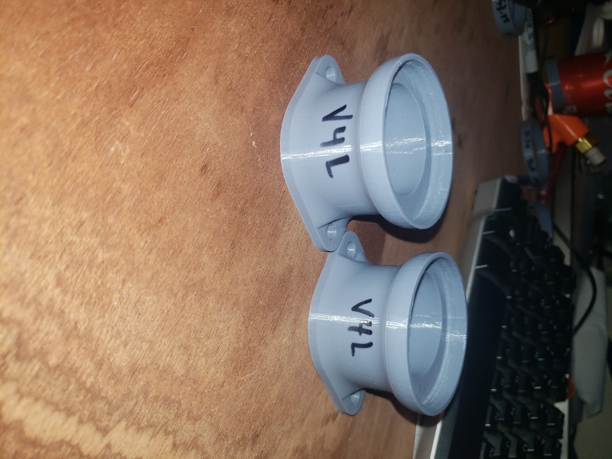 For V4, I re-added the eccentric opening for the TB, made the adapter taller to better accomadate the fasteners and allen keys to reach them, and then made generic Left and Right versions of each TB adapters, because the eccentricity of the throttle body and perpendicular bolt pattern between engine sides means that they'd need to be different. V4 was a success! Now to account for the different cylinder spacing vs TB spacing within adapters.