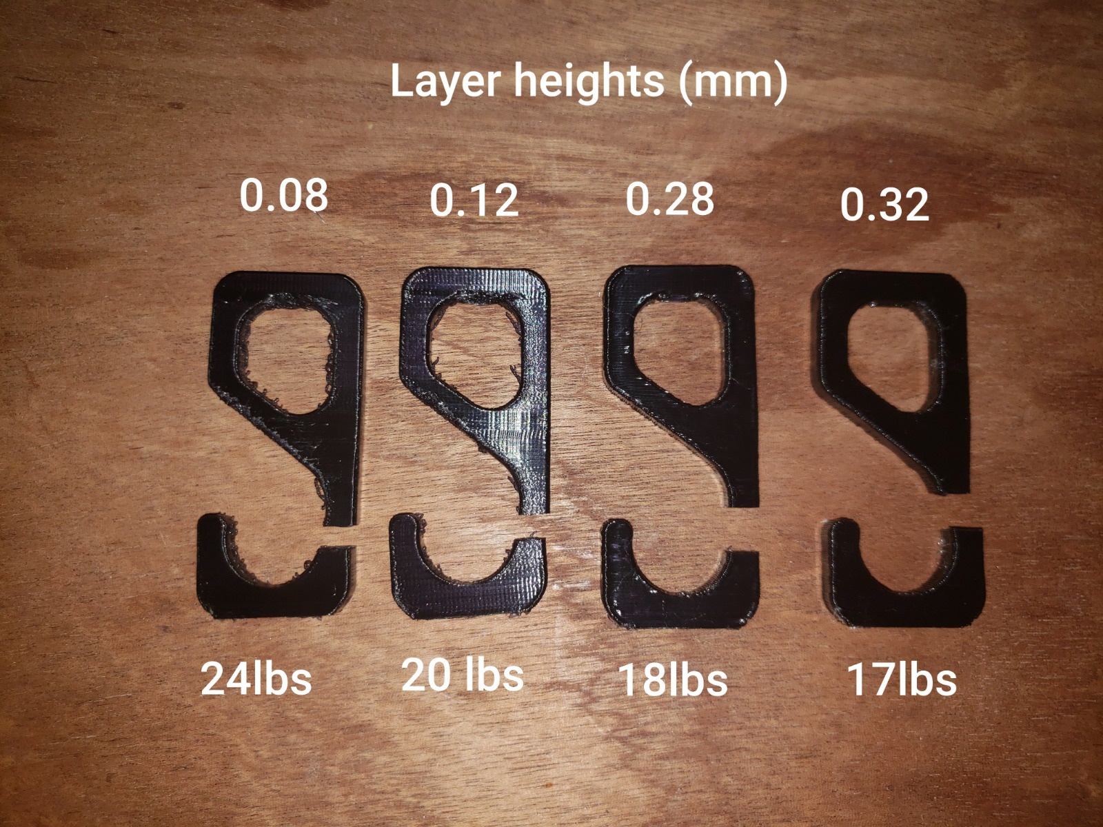 Printing at 0.08mm layer height and 260C is strongest, but printing at such fine detail would make each adapter print for almost 12 hours! I'll have to decide which layer height is the best compromise.