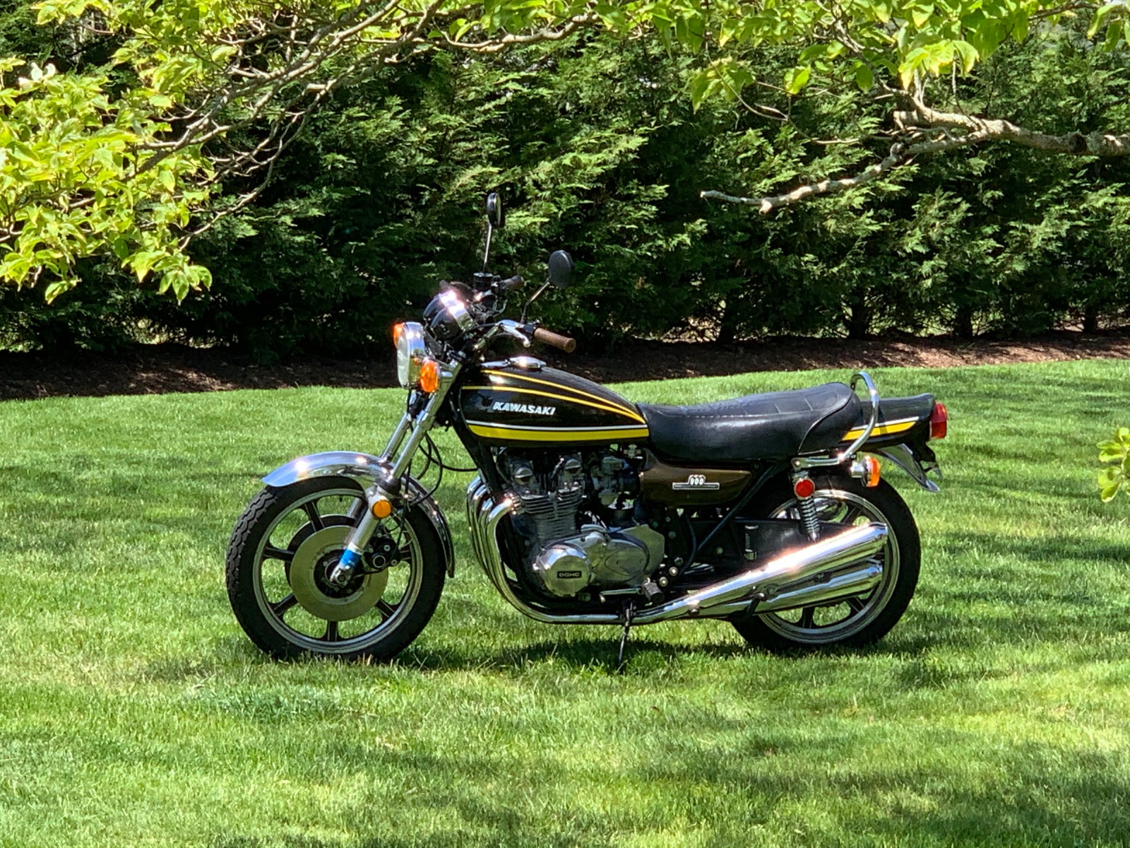 10 Jul 2020 17:01Before and after, just cleaned and assembled from various across the product line in those years, and a lot of info gathered from threads posted here, thanks, front end from different 750's, wanted dual brakes, rebuilt calipers and mc, replaced wiring harness, old was toast, pair of old Z1 bars , old were bent, and a pair of old Z1 mirrors, for now, had them, headlight is a Stanley 1970 model for h4 lamp h4 led works well, moved blinkers off bars, switched headlight and running lights, (used a repo Z1 unit easy to do), tank is from a 750, (needed a really short 44mm petcock), paint is spray cans, found a seat on ebay, rear wheel is from a 550, (thanks martin csr), carbs from a 78 rebuilt and working well, all epa stuff gone, new brakes and pads, chain and sprockets, new tires as the ones that came with the wheels were really old, Dunlop d404s, were reasonable, Delkevic pipe was most reasonable for that , just having some fun with this, and after looking at the other projects going on this is nothing, time for a can of patience( comes in 6 or 12 packs) it hot out, thanks