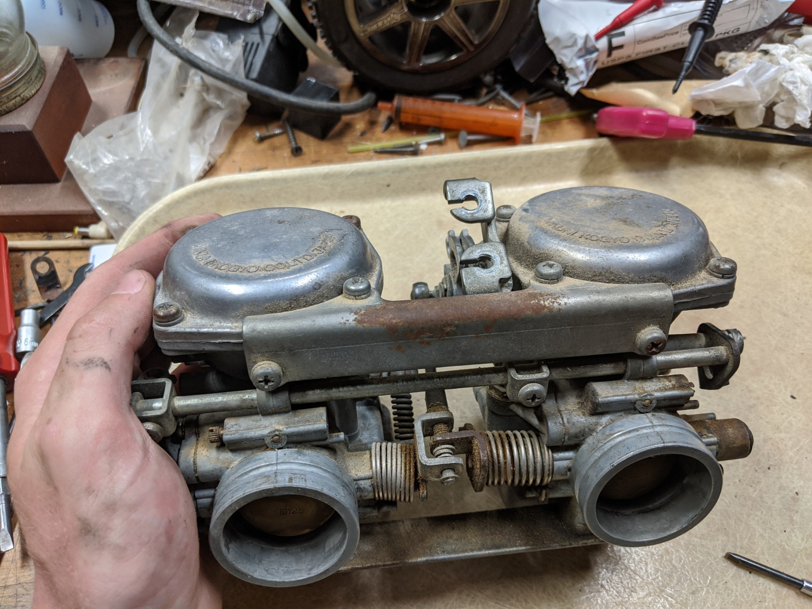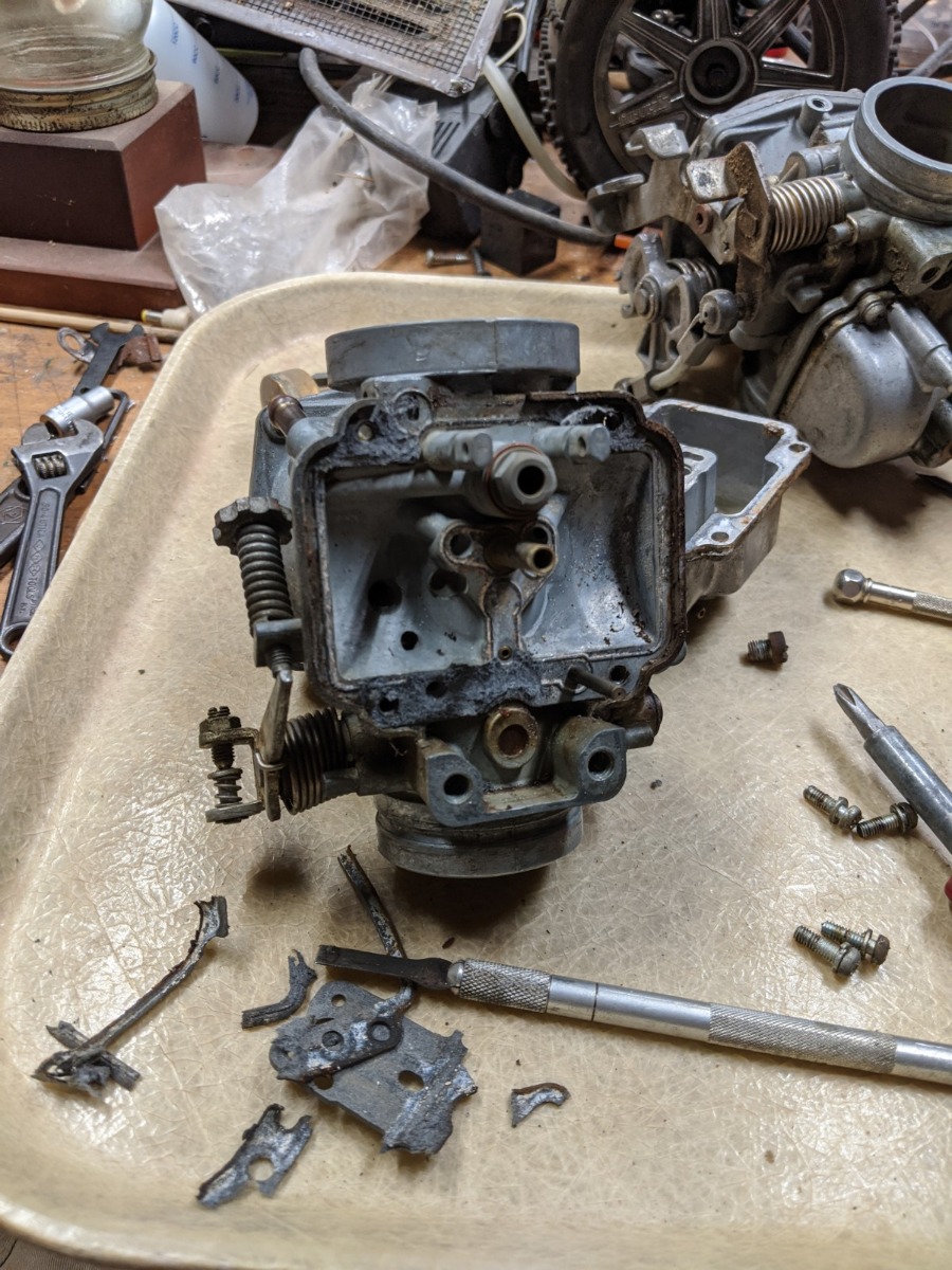 So I've been slowly plugging away at the bike recently., and got a few things done. I ultrasonically cleaned and rebuilt the carbs, and unfortunately while doing so noticed that the left carb's idle adjust screw (NOT the mixture screw) is stripped at the carb body. :side: I plan on drilling out the hole, filling it with JB weld, and tapping new threads into it. We'll see how that holds up. I might need to remove the return spring though, because I have a feeling that it's what stripped the housing (it's SUUUUPER stiff). I also bought a new coil, plug wires, and plug caps, and after installing them I got spark! Once I reinstalled the (slightly broken, not synchronized) carburetors, I kicked it over about 1,000,000 times, then took a break to order a new starter clutch... :laugh: But on the millionth-and-first kick it started!! I only ran it for a few seconds, as it doesn't currently have an air filter on it, but I'll still count it. That's where I'm at now, though. I have pod filters and a starter clutch coming tomorrow, and a spare set of jets that came with the rebuild kit to try drilling larger. We'll see where that goes!