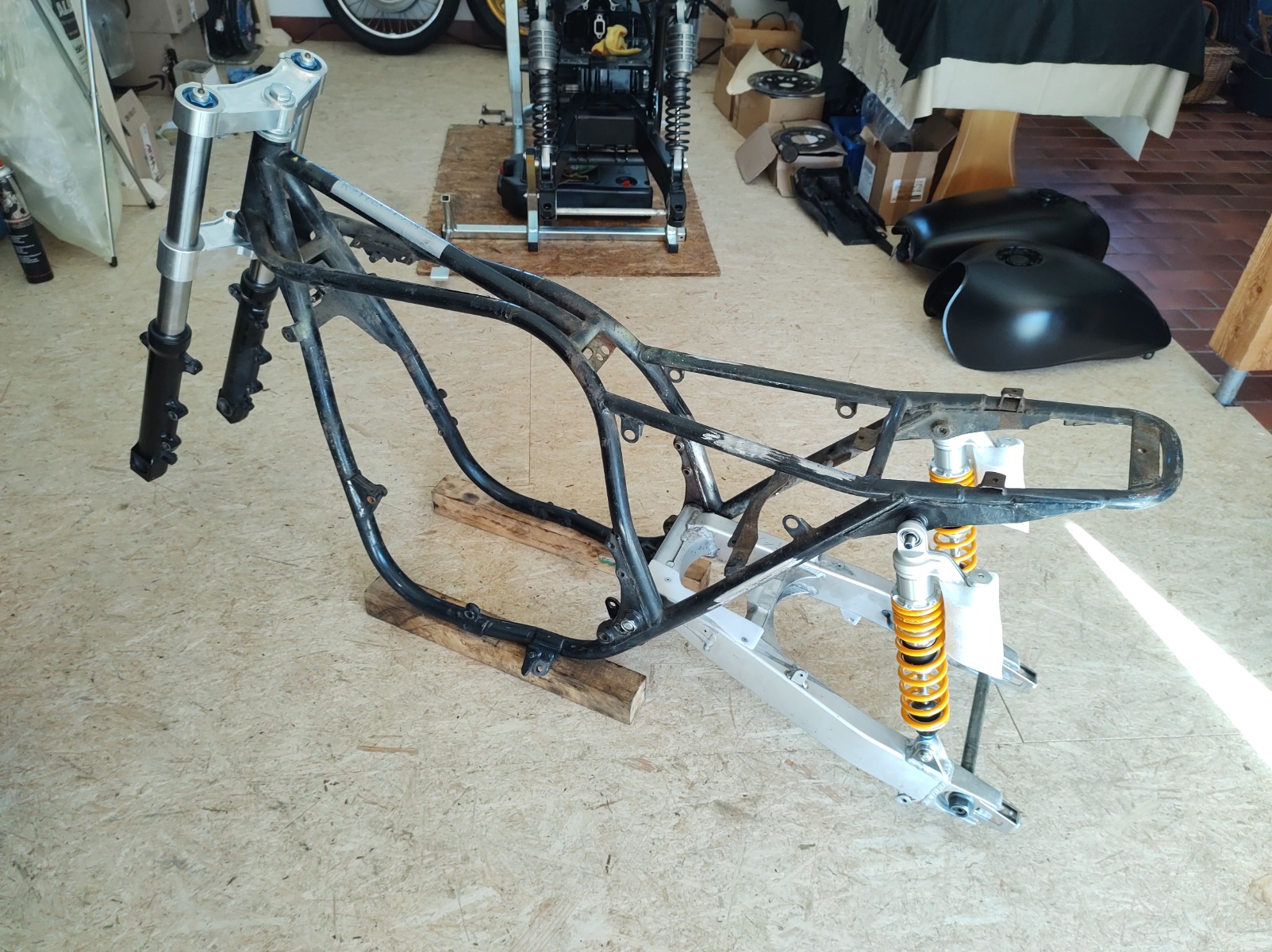The modified GSX-R swingarm and Öhlins shocks arrived yesterday. I'll be chopping a few things off the frame tomorrow so I can get the swingarm mounted (brake pedal bracket needs to go). Once that's done I can get the ZRX forks back in and check the height of the front and back axles. If I'm lucky the bike will be level at the middle of the height adjustment range on the shocks.
