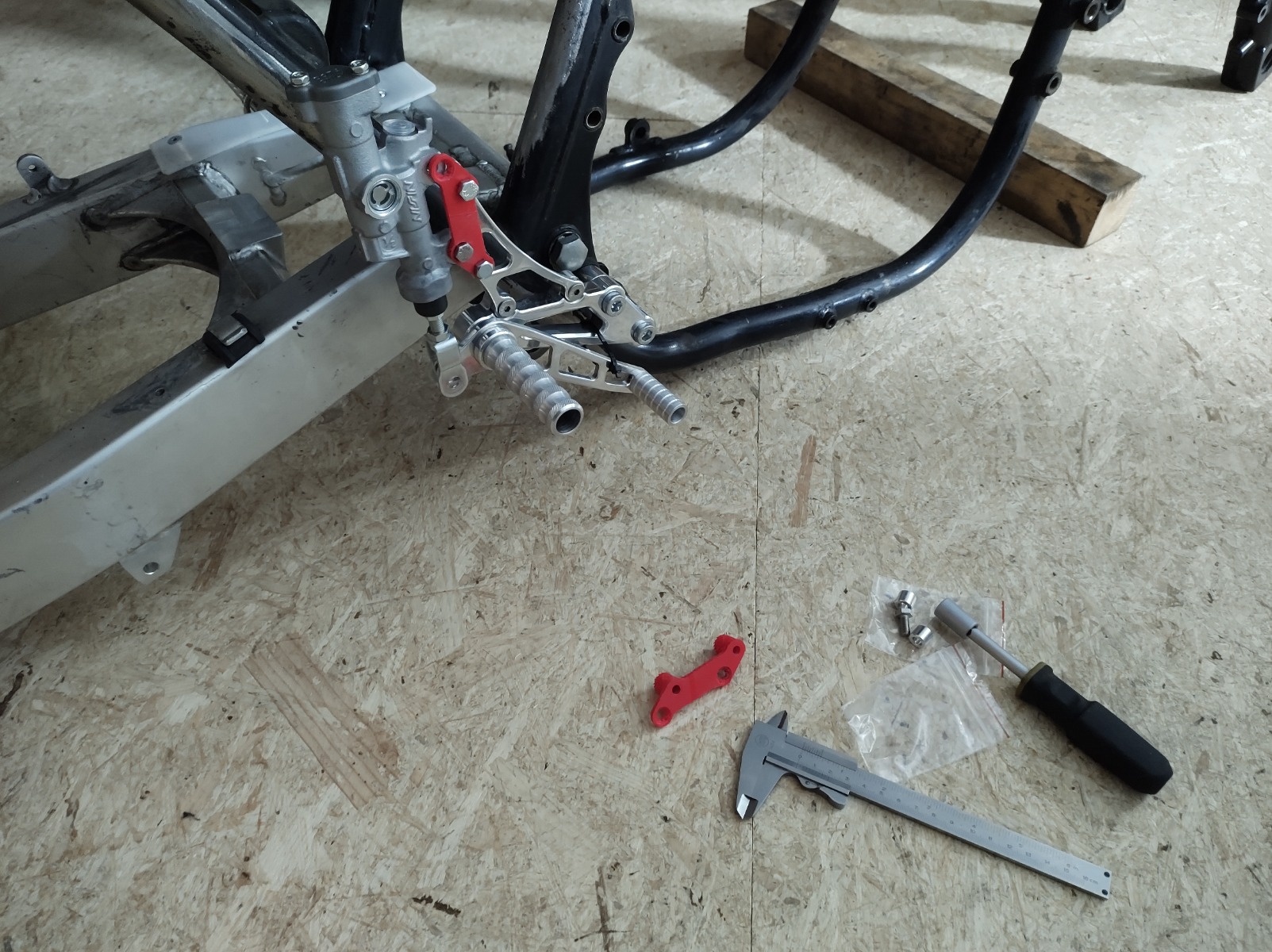 Still waiting on my wheels so I can figure out where the shock mounts need to go. Been keeping busy with the Zephyr but did get the new rearsets so I chucked them on to see if I could bend my knees enough to get my feet on them. The ended up being perfect, don't even need a higher seat (6'1" with long legs so I sometimes have problems). Need to make a bracket for the rear master cylinder as it the bracket is made for a ZX-9R cylinder. I printed a couple out at school to test before I sent the final model off to a friend with a CNC machine.