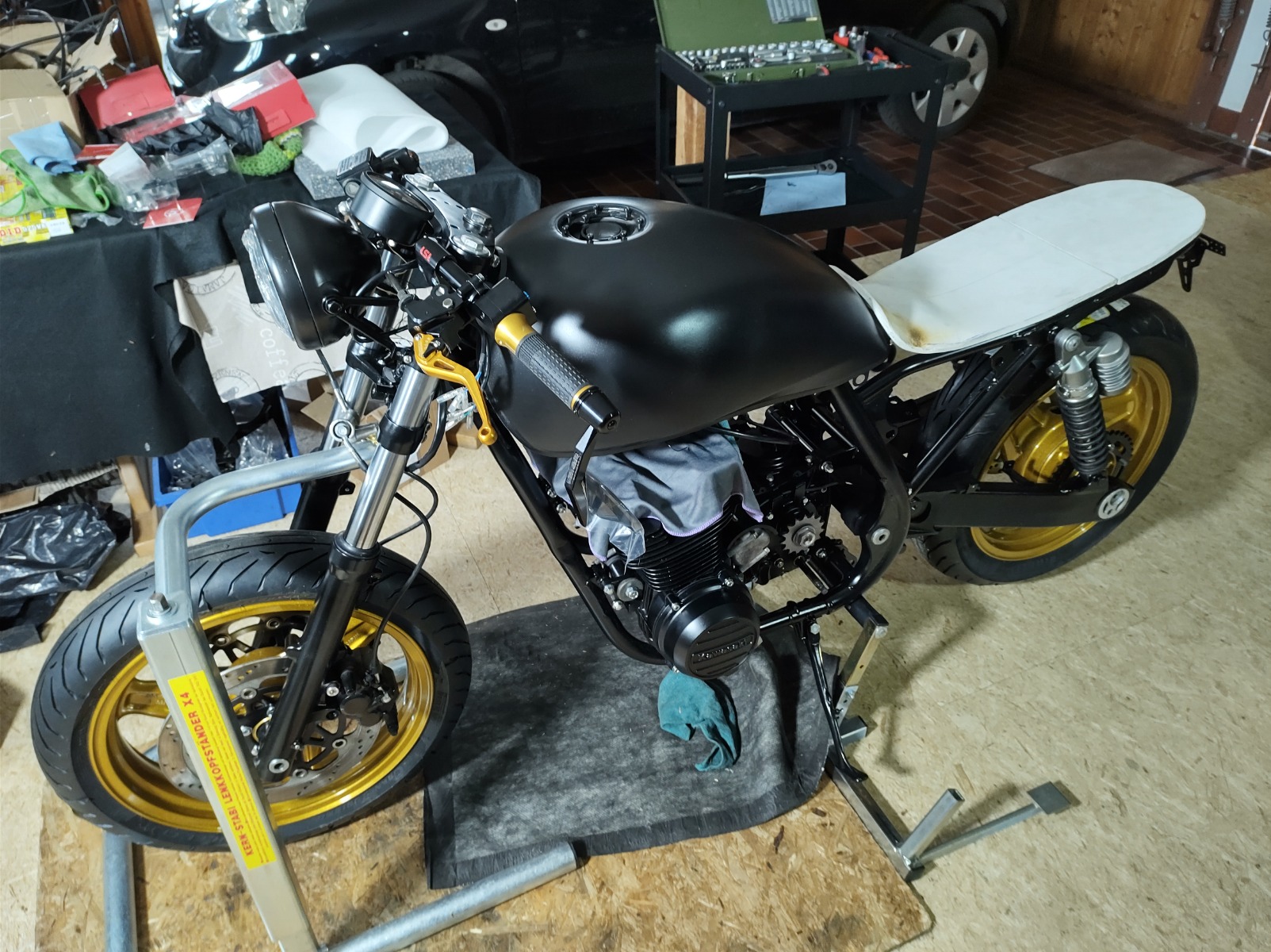 Some goodies arrived last week. I wanted to mount the tires on the weekend and realised I had ordered the front tire in the worng size! I ordered it at the same time as the tires for the Zephyr and must have got mixed up. New tire should be here tomorrow, and the boy now has a replacement for the front when he burns through his Pirelli's.