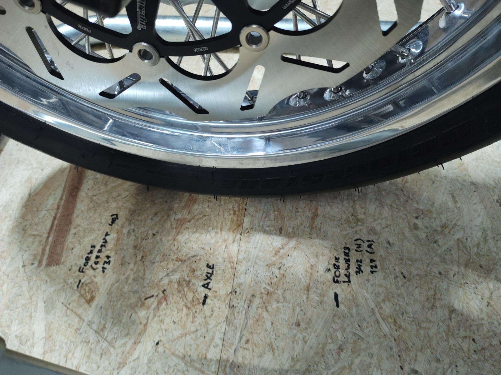 I waited until the wheels arrived before taking any measurements so I could be sure of the numbers. I am just going to set eveything up with the suspension unloaded - if I set the static sag correctly the trail won't change with the engine etc. in the frame.