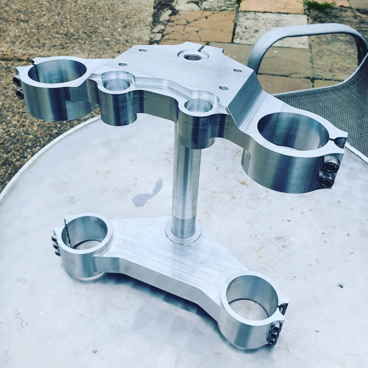 02 May 2021 12:23They made the triples I have now and they do a triple clamp with a drop (on both yokes). Not sure if they'd do a drop on just the top yoke - it depends on what they have the MOT paperwork for. I'll check with them tomorrow.Maybe you could ask your friends at RF-Biketech what it would cost to make a custom top clamp. A top clamp seems simpler than those wheels they made. At 30mm of drop you may have tank interference issues, but maybe you could also incorporate the clip-on mounts into the top clamp?