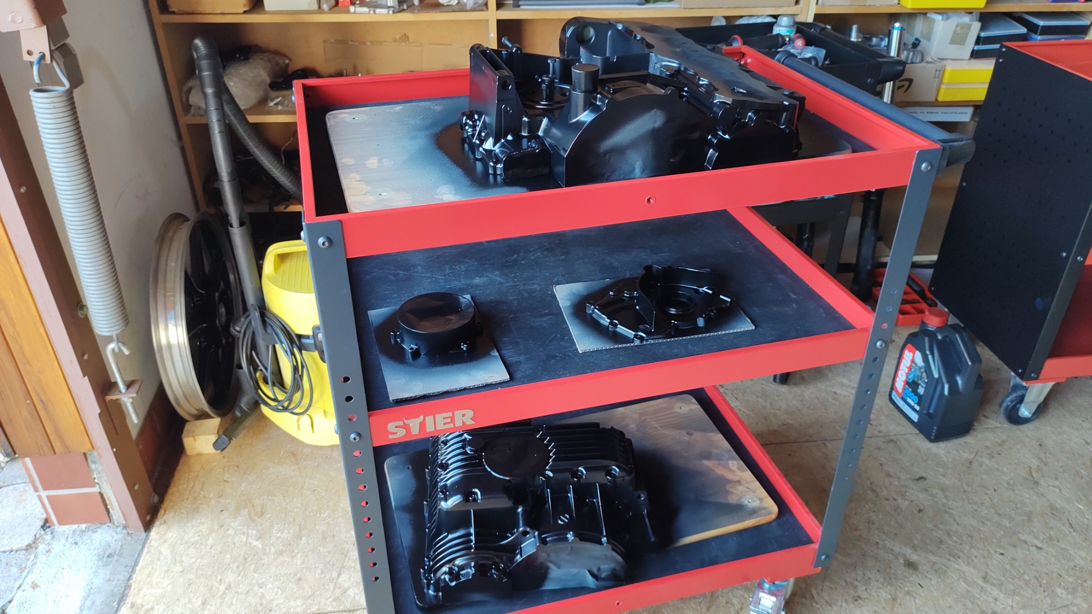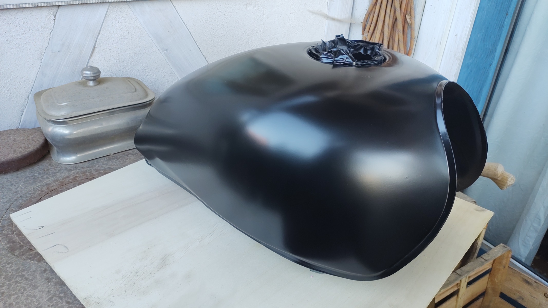 Got some time in the neighbours spray room yesterday. Got the crankcases done as well as the tank for another project (93 Zephyr). Heading away for 10 days tomorrow, will try and get the head and cylinders done when I get back. I want to have it painted before I do the first mock-up so it will be easier to decide on the colour of the tank and tail.