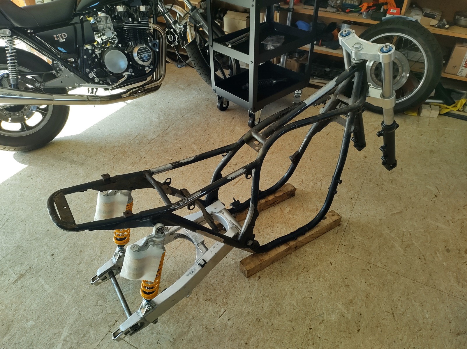 The modified GSX-R swingarm and Öhlins shocks arrived yesterday. I'll be chopping a few things off the frame tomorrow so I can get the swingarm mounted (brake pedal bracket needs to go). Once that's done I can get the ZRX forks back in and check the height of the front and back axles. If I'm lucky the bike will be level at the middle of the height adjustment range on the shocks.